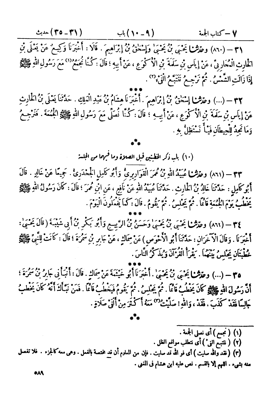 31 - (860) وحَدَّثَنَا يَحْيَى بْنُ يَحْيَى، وَإِسْحَاقُ بْنُ إِبْرَاهِيمَ، قَالَا: أَخْبَرَنَا وَكِيعٌ، عَنْ يَعْلَى بْنِ الْحَارِثِ الْمُحَارِبِيِّ، عَنْ إِيَاسِ بْنِ سَلَمَةَ بْنِ الْأَكْوَعِ، عَنْ أَبِيهِ، قَالَ: «كُنَّا §نُجَمِّعُ مَعَ رَسُولِ اللهِ صَلَّى اللهُ عَلَيْهِ وَسَلَّمَ، إِذَا زَالَتِ الشَّمْسُ، ثُمَّ نَرْجِعُ نَتَتَبَّعُ الْفَيْءَ»