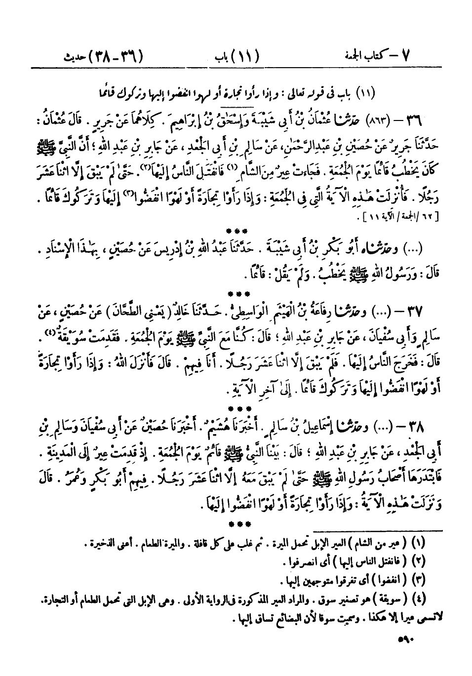 36 - (863) حَدَّثَنَا عُثْمَانُ بْنُ أَبِي شَيْبَةَ، وَإِسْحَاقُ بْنُ إِبْرَاهِيمَ، كِلَاهُمَا عَنْ جَرِيرٍ، قَالَ عُثْمَانُ: حَدَّثَنَا جَرِيرٌ، عَنْ حُصَيْنِ بْنِ عَبْدِ الرَّحْمَنِ، عَنْ سَالِمِ بْنِ أَبِي الْجَعْدِ، عَنْ جَابِرِ بْنِ عَبْدِ اللهِ، " أَنَّ النَّبِيَّ صَلَّى اللهُ عَلَيْهِ وَسَلَّمَ، كَانَ §يَخْطُبُ قَائِمًا يَوْمَ الْجُمُعَةِ، فَجَاءَتْ عِيرٌ مِنَ الشَّامِ، فَانْفَتَلَ النَّاسُ إِلَيْهَا، حَتَّى لَمْ يَبْقَ إِلَّا اثْنَا عَشَرَ رَجُلًا، فَأُنْزِلَتْ هَذِهِ الْآيَةُ الَّتِي فِي الْجُمُعَةِ: {وَإِذَا رَأَوْا تِجَارَةً أَوْ لَهْوًا انْفَضُّوا إِلَيْهَا وَتَرَكُوكَ قَائِمًا} [الجمعة: 11] ".