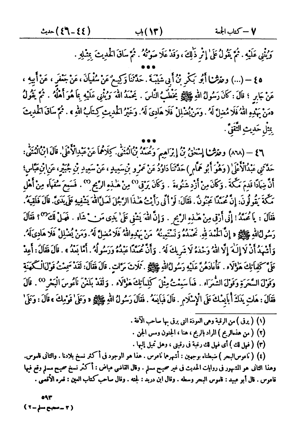 46 - (868) وحَدَّثَنَا إِسْحَاقُ بْنُ إِبْرَاهِيمَ، وَمُحَمَّدُ بْنُ الْمُثَنَّى، كِلَاهُمَا عَنْ عَبْدِ الْأَعْلَى، قَالَ ابْنُ الْمُثَنَّى: حَدَّثَنِي عَبْدُ الْأَعْلَى وَهُوَ أَبُو هَمَّامٍ، حَدَّثَنَا دَاوُدُ، عَنْ عَمْرِو بْنِ سَعِيدٍ، عَنْ سَعِيدِ بْنِ جُبَيْرٍ، عَنِ ابْنِ عَبَّاسٍ، أَنَّ ضِمَادًا، قَدِمَ مَكَّةَ وَكَانَ مِنْ أَزْدِ شَنُوءَةَ، وَكَانَ يَرْقِي مِنْ هَذِهِ الرِّيحِ، فَسَمِعَ سُفَهَاءَ مِنْ أَهْلِ مَكَّةَ، يَقُولُونَ: إِنَّ مُحَمَّدًا مَجْنُونٌ، فَقَالَ: لَوْ أَنِّي رَأَيْتُ هَذَا الرَّجُلَ لَعَلَّ اللهَ يَشْفِيهِ عَلَى يَدَيَّ، قَالَ فَلَقِيَهُ، فَقَالَ: يَا مُحَمَّدُ إِنِّي أَرْقِي مِنْ هَذِهِ الرِّيحِ، وَإِنَّ اللهَ يَشْفِي عَلَى يَدِي مَنْ شَاءَ، فَهَلْ لَكَ؟ فَقَالَ رَسُولُ اللهِ صَلَّى اللهُ عَلَيْهِ وَسَلَّمَ: «إِنَّ الْحَمْدَ لِلَّهِ، نَحْمَدُهُ وَنَسْتَعِينُهُ، §مَنْ يَهْدِهِ اللهُ فَلَا مُضِلَّ لَهُ، وَمَنْ يُضْلِلْ فَلَا هَادِيَ لَهُ، وَأَشْهَدُ أَنْ لَا إِلَهَ إِلَّا اللهُ وَحْدَهُ لَا شَرِيكَ لَهُ، وَأَنَّ مُحَمَّدًا عَبْدُهُ وَرَسُولُهُ، أَمَّا بَعْدُ» قَالَ: فَقَالَ: أَعِدْ عَلَيَّ كَلِمَاتِكَ هَؤُلَاءِ، فَأَعَادَهُنَّ عَلَيْهِ رَسُولُ اللهِ صَلَّى اللهُ عَلَيْهِ وَسَلَّمَ، ثَلَاثَ مَرَّاتٍ، قَالَ: فَقَالَ: لَقَدْ سَمِعْتُ قَوْلَ الْكَهَنَةِ، وَقَوْلَ السَّحَرَةِ، وَقَوْلَ الشُّعَرَاءِ، فَمَا سَمِعْتُ مِثْلَ كَلِمَاتِكَ هَؤُلَاءِ، وَلَقَدْ بَلَغْنَ نَاعُوسَ الْبَحْرِ، قَالَ: فَقَالَ: هَاتِ يَدَكَ أُبَايِعْكَ عَلَى الْإِسْلَامِ، قَالَ: فَبَايَعَهُ، فَقَالَ رَسُولُ اللهِ صَلَّى اللهُ عَلَيْهِ وَسَلَّمَ: «وَعَلَى قَوْمِكَ»، قَالَ: وَعَلَى قَوْمِي، قَالَ: فَبَعَثَ رَسُولُ اللهِ صَلَّى اللهُ عَلَيْهِ وَسَلَّمَ سَرِيَّةً، فَمَرُّوا بِقَوْمِهِ، فَقَالَ صَاحِبُ السَّرِيَّةِ لِلْجَيْشِ: هَلْ أَصَبْتُمْ مِنْ هَؤُلَاءِ شَيْئًا؟ فَقَالَ رَجُلٌ مِنَ الْقَوْمِ: أَصَبْتُ مِنْهُمْ مِطْهَرَةً، فَقَالَ: رُدُّوهَا، فَإِنَّ هَؤُلَاءِ قَوْمُ ضِمَادٍ