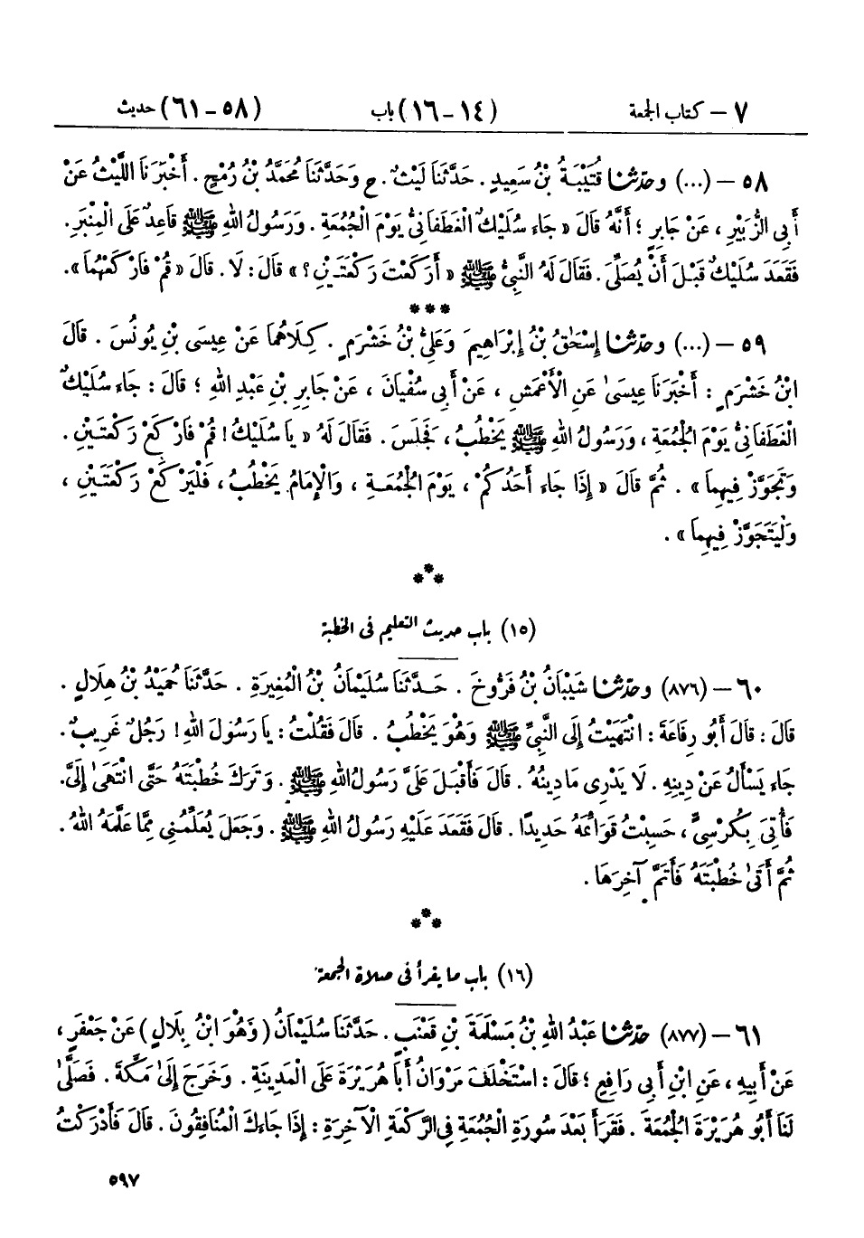 58 - (875) وحَدَّثَنَا قُتَيْبَةُ بْنُ سَعِيدٍ، حَدَّثَنَا لَيْثٌ، ح وحَدَّثَنَا مُحَمَّدُ بْنُ رُمْحٍ، أَخْبَرَنَا اللَّيْثُ، عَنْ أَبِي الزُّبَيْرِ، عَنْ جَابِرٍ، أَنَّهُ قَالَ: جَاءَ سُلَيْكٌ الْغَطَفَانِيُّ يَوْمَ الْجُمُعَةِ، وَرَسُولُ اللهِ صَلَّى اللهُ عَلَيْهِ وَسَلَّمَ قَاعِدٌ عَلَى الْمِنْبَرِ، فَقَعَدَ سُلَيْكٌ قَبْلَ أَنْ يُصَلِّيَ، فَقَالَ لَهُ النَّبِيُّ صَلَّى اللهُ عَلَيْهِ وَسَلَّمَ: «§أَرَكَعْتَ رَكْعَتَيْنِ؟» قَالَ: لَا، قَالَ: «قُمْ فَارْكَعْهُمَا»