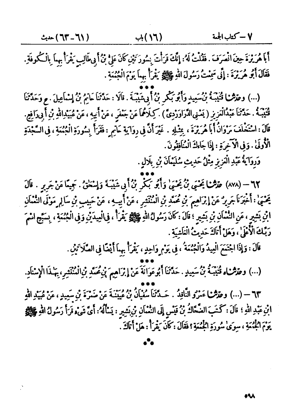 63 - (878) وحَدَّثَنَا عَمْرٌو النَّاقِدُ، حَدَّثَنَا سُفْيَانُ بْنُ عُيَيْنَةَ، عَنْ ضَمْرَةَ بْنِ سَعِيدٍ، عَنْ عُبَيْدِ اللهِ بْنِ عَبْدِ اللهِ، قَالَ: كَتَبَ الضَّحَّاكُ بْنُ قَيْسٍ إِلَى النُّعْمَانِ بْنِ بَشِيرٍ يَسْأَلُهُ: أَيَّ شَيْءٍ قَرَأَ رَسُولُ اللهِ صَلَّى اللهُ عَلَيْهِ وَسَلَّمَ يَوْمَ الْجُمُعَةِ، سِوَى سُورَةِ الْجُمُعَةِ؟ فَقَالَ: «كَانَ §يَقْرَأُ هَلْ أَتَاكَ»