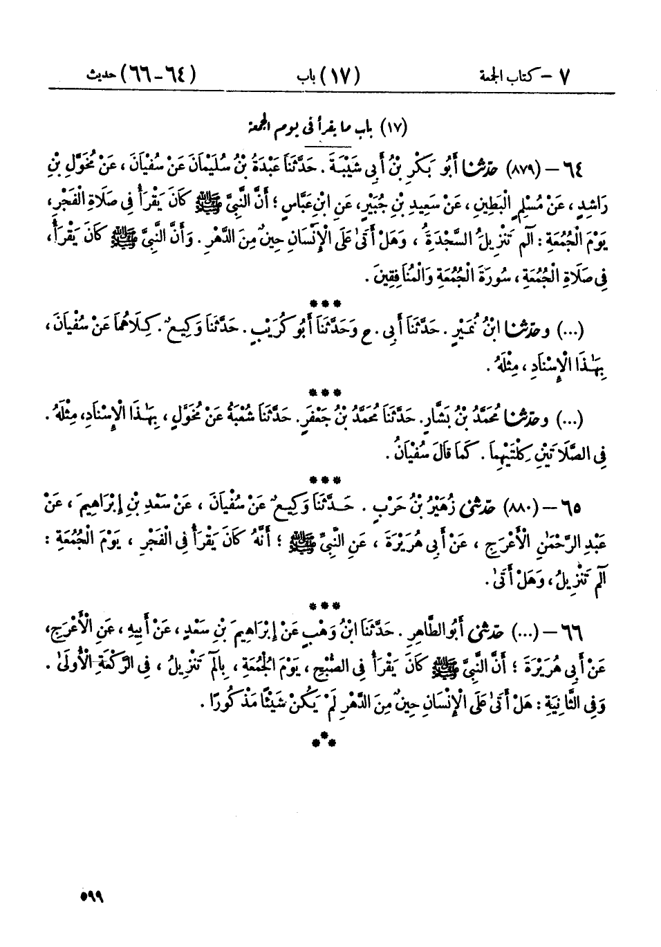 65 - (880) حَدَّثَنِي زُهَيْرُ بْنُ حَرْبٍ، حَدَّثَنَا وَكِيعٌ، عَنْ سُفْيَانَ، عَنْ سَعْدِ بْنِ إِبْرَاهِيمَ، عَنْ عَبْدِ الرَّحْمَنِ الْأَعْرَجِ، عَنْ أَبِي هُرَيْرَةَ، عَنِ النَّبِيِّ صَلَّى اللهُ عَلَيْهِ وَسَلَّمَ، " أَنَّهُ كَانَ §يَقْرَأُ فِي الْفَجْرِ، يَوْمَ الْجُمُعَةِ: الم تَنْزِيلُ، وَهَلْ أَتَى "