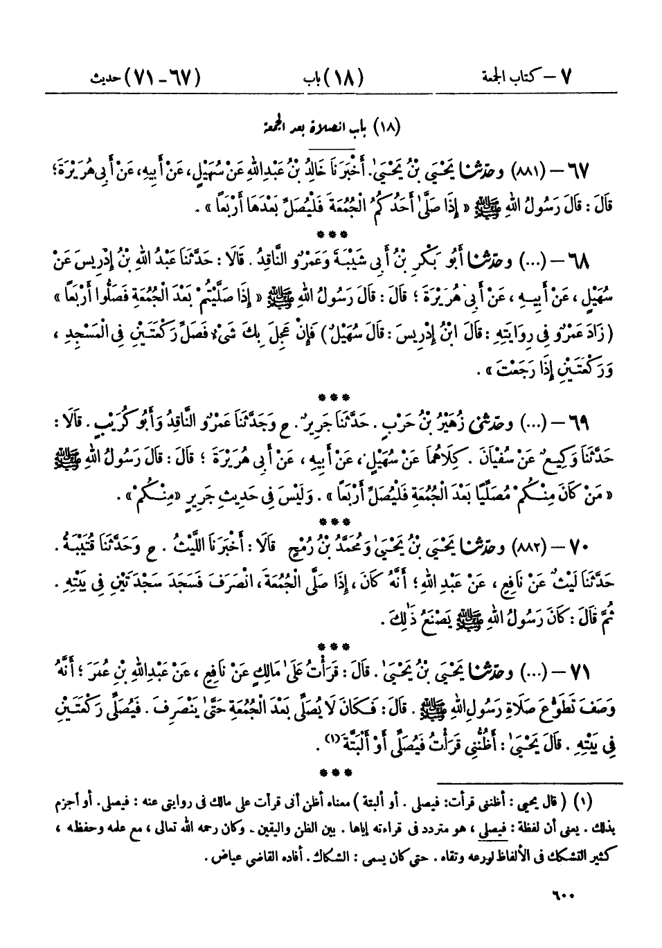 71 - (882) وحَدَّثَنَا يَحْيَى بْنُ يَحْيَى، قَالَ: قَرَأْتُ عَلَى مَالِكٍ، عَنْ نَافِعٍ، عَنْ عَبْدِ اللهِ بْنِ عُمَرَ، أَنَّهُ §وَصَفَ تَطَوُّعَ صَلَاةِ رَسُولِ اللهِ صَلَّى اللهُ عَلَيْهِ وَسَلَّمَ، قَالَ: «فَكَانَ لَا يُصَلِّي بَعْدَ الْجُمُعَةِ حَتَّى يَنْصَرِفَ، فَيُصَلِّي رَكْعَتَيْنِ فِي بَيْتِهِ». قَالَ يَحْيَى: أَظُنُّنِي قَرَأْتُ فَيُصَلِّي، أَوْ أَلْبَتَّةَ