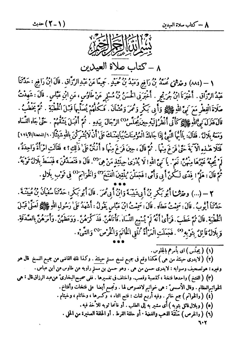 1 - (884) وحَدَّثَنِي مُحَمَّدُ بْنُ رَافِعٍ، وَعَبْدُ بْنُ حُمَيْدٍ، جَمِيعًا عَنْ عَبْدِ الرَّزَّاقِ، قَالَ ابْنُ رَافِعٍ: حَدَّثَنَا عَبْدُ الرَّزَّاقِ، أَخْبَرَنَا ابْنُ جُرَيْجٍ، أَخْبَرَنِي الْحَسَنُ بْنُ مُسْلِمٍ، عَنْ طَاوُسٍ، عَنِ ابْنِ عَبَّاسٍ، قَالَ: شَهِدْتُ صَلَاةَ الْفِطْرِ مَعَ نَبِيِّ اللهِ صَلَّى اللهُ عَلَيْهِ وَسَلَّمَ، وَأَبِي بَكْرٍ، وَعُمَرَ، وَعُثْمَانَ، فَكُلُّهُمْ يُصَلِّيهَا قَبْلَ الْخُطْبَةِ، ثُمَّ يَخْطُبُ، قَالَ: فَنَزَلَ نَبِيُّ اللهِ صَلَّى اللهُ عَلَيْهِ وَسَلَّمَ كَأَنِّي أَنْظُرُ إِلَيْهِ حِينَ يُجَلِّسُ الرِّجَالَ بِيَدِهِ، ثُمَّ أَقْبَلَ يَشُقُّهُمْ، حَتَّى جَاءَ النِّسَاءَ، وَمَعَهُ بِلَالٌ، فَقَالَ: يَا أَيُّهَا النَّبِيُّ {§إِذَا جَاءَكَ الْمُؤْمِنَاتُ يُبَايِعْنَكَ عَلَى أَنْ لَا يُشْرِكْنَ بِاللهِ شَيْئًا} [الممتحنة: 12]، فَتَلَا هَذِهِ الْآيَةَ حَتَّى فَرَغَ مِنْهَا، ثُمَّ قَالَ: حِينَ فَرَغَ مِنْهَا «أَنْتُنَّ عَلَى ذَلِكِ؟» فَقَالَتِ امْرَأَةٌ وَاحِدَةٌ، لَمْ يُجِبْهُ غَيْرُهَا مِنْهُنَّ: نَعَمْ، يَا نَبِيَّ اللهِ لَا يُدْرَى حِينَئِذٍ مَنْ هِيَ، قَالَ: «فَتَصَدَّقْنَ»، فَبَسَطَ بِلَالٌ ثَوْبَهُ، ثُمَّ قَالَ: هَلُمَّ فِدًى لَكُنَّ أَبِي وَأُمِّي، فَجَعَلْنَ يُلْقِينَ الْفَتَخَ، وَالْخَوَاتِمَ فِي ثَوْبِ بِلَالٍ