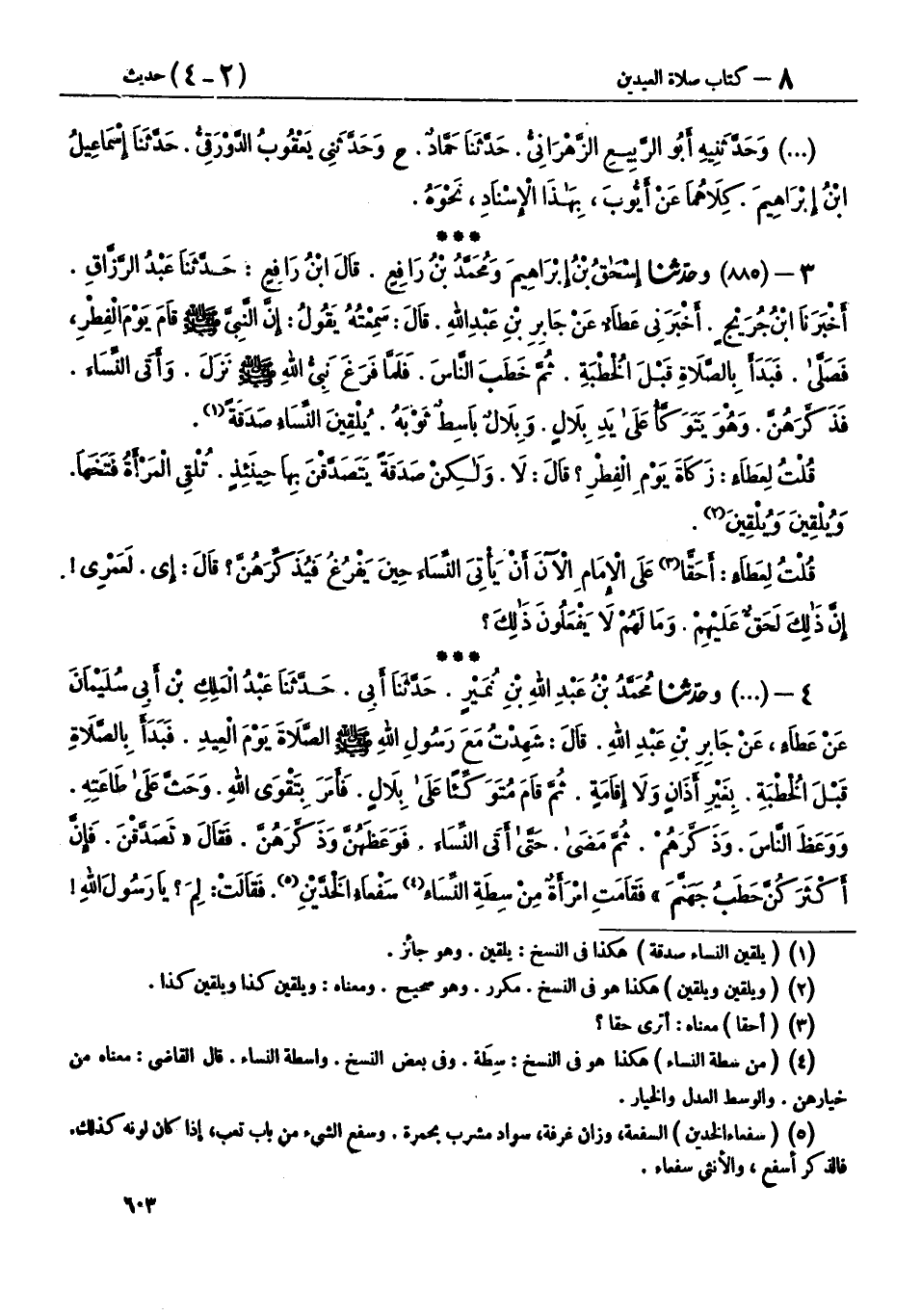 3 - (885) وحَدَّثَنَا إِسْحَاقُ بْنُ إِبْرَاهِيمَ، وَمُحَمَّدُ بْنُ رَافِعٍ قال ابْنُ رَافِعٍ: حَدَّثَنَا عَبْدُ الرَّزَّاقِ، أَخْبَرَنَا ابْنُ جُرَيْجٍ، أَخْبَرَنِي عَطَاءٌ، عَنْ جَابِرِ بْنِ عَبْدِ اللهِ، قَالَ: سَمِعْتُهُ يَقُولُ: «إِنَّ النَّبِيَّ صَلَّى اللهُ عَلَيْهِ وَسَلَّمَ §قَامَ يَوْمَ الْفِطْرِ، فَصَلَّى، فَبَدَأَ بِالصَّلَاةِ قَبْلَ الْخُطْبَةِ، ثُمَّ خَطَبَ النَّاسَ، فَلَمَّا فَرَغَ نَبِيُّ اللهِ صَلَّى اللهُ عَلَيْهِ وَسَلَّمَ نَزَلَ، وَأَتَى النِّسَاءَ، فَذَكَّرَهُنَّ، وَهُوَ يَتَوَكَّأُ عَلَى يَدِ بِلَالٍ، وَبِلَالٌ بَاسِطٌ ثَوْبَهُ، يُلْقِينَ النِّسَاءُ صَدَقَةً» قُلْتُ لِعَطَاءٍ: زَكَاةَ يَوْمِ الْفِطْرِ؟ قَالَ: «لَا، وَلَكِنْ صَدَقَةً يَتَصَدَّقْنَ بِهَا حِينَئِذٍ، تُلْقِي الْمَرْأَةُ فَتَخَهَا، وَيُلْقِينَ وَيُلْقِينَ»، قُلْتُ لِعَطَاءٍ: أَحَقًّا عَلَى الْإِمَامِ الْآنَ أَنْ يَأْتِيَ النِّسَاءَ حِينَ يَفْرُغُ فَيُذَكِّرَهُنَّ؟ قَالَ: «إِي، لَعَمْرِي إِنَّ ذَلِكَ لَحَقٌّ عَلَيْهِمْ، وَمَا لَهُمْ لَا يَفْعَلُونَ ذَلِكَ؟»