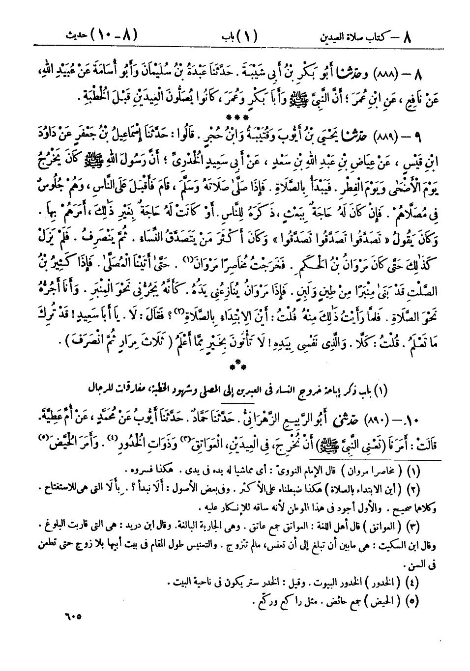 1 - بَابُ ذِكْرِ إِبَاحَةِ خُرُوجِ النِّسَاءِ فِي الْعِيدَيْنِ إِلَى الْمُصَلَّى وَشُهُودِ الْخُطْبَةِ، مُفَارِقَاتٌ لِلرِّجَالِ