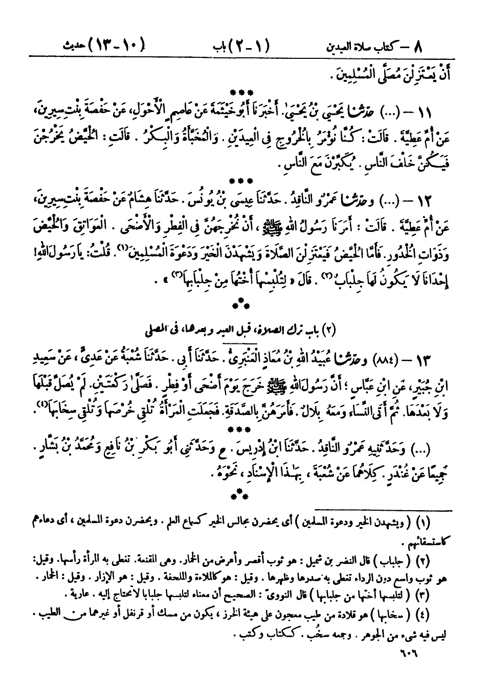 12 - (890) وحَدَّثَنَا عَمْرٌو النَّاقِدُ، حَدَّثَنَا عِيسَى بْنُ يُونُسَ، حَدَّثَنَا هِشَامٌ، عَنْ حَفْصَةَ بِنْتِ سِيرِينَ، عَنْ أُمِّ عَطِيَّةَ، قَالَتْ: أَمَرَنَا رَسُولُ اللهِ صَلَّى اللهُ عَلَيْهِ وَسَلَّمَ، أَنْ §نُخْرِجَهُنَّ فِي الْفِطْرِ وَالْأَضْحَى، الْعَوَاتِقَ، وَالْحُيَّضَ، وَذَوَاتِ الْخُدُورِ، فَأَمَّا الْحُيَّضُ فَيَعْتَزِلْنَ الصَّلَاةَ، وَيَشْهَدْنَ الْخَيْرَ، وَدَعْوَةَ الْمُسْلِمِينَ، قُلْتُ: يَا رَسُولَ اللهِ إِحْدَانَا لَا يَكُونُ لَهَا جِلْبَابٌ، قَالَ: «لِتُلْبِسْهَا أُخْتُهَا مِنْ جِلْبَابِهَا»