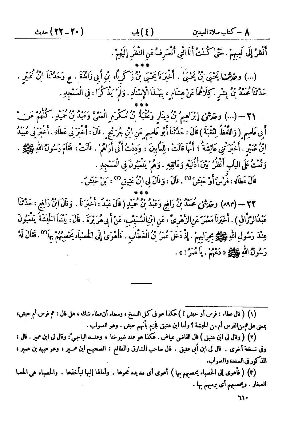 S [ ش (قال عطاء فرس أو حبش؟) هكذا هو في كل النسخ ومعناه أن عطاء شك هل قال هم فرس أم حبش بمعنى هل هم من الفرس أم من الحبش؟ وأما ابن عتيق فجزم بأنهم حبش وهو الصواب (وقال لي ابن عتيق) قال القاضي عياض هكذا هو عند شيوخنا وعند الباجي وقال لي ابن عمير قال وفي نسخة أخرى قال لي ابن أبي عتيق قال صاحب المشارق والمطالع الصحيح ابن عمير وهو عبيد بن عمير المذكور في السند والصواب]