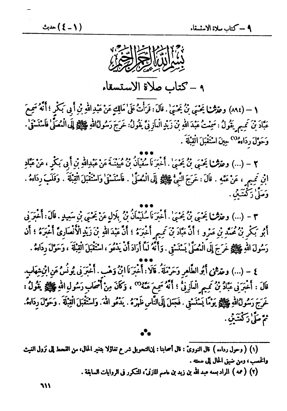 1 - (894) وحَدَّثَنَا يَحْيَى بْنُ يَحْيَى، قَالَ: قَرَأْتُ عَلَى مَالِكٍ، عَنْ عَبْدِ اللهِ بْنِ أَبِي بَكْرٍ، أَنَّهُ سَمِعَ عَبَّادَ بْنَ تَمِيمٍ، يَقُولُ: سَمِعْتُ عَبْدَ اللهِ بْنَ زَيْدٍ الْمَازِنِيَّ، يَقُولُ: «§خَرَجَ رَسُولُ اللهِ صَلَّى اللهُ عَلَيْهِ وَسَلَّمَ إِلَى الْمُصَلَّى، فَاسْتَسْقَى، وَحَوَّلَ رِدَاءَهُ حِينَ اسْتَقْبَلَ الْقِبْلَةَ»