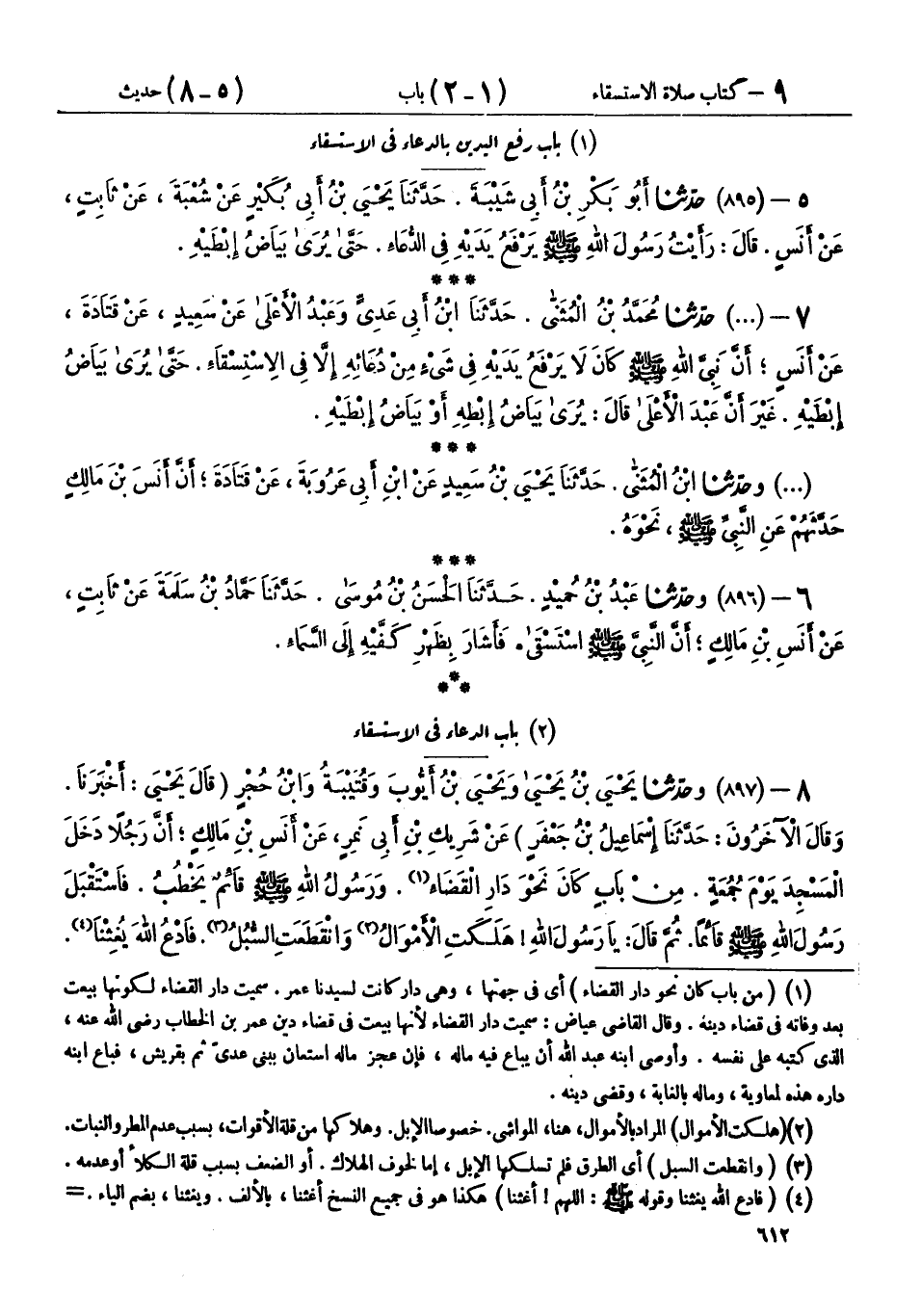 5 - (895) حَدَّثَنَا أَبُو بَكْرِ بْنُ أَبِي شَيْبَةَ، حَدَّثَنَا يَحْيَى بْنُ أَبِي بُكَيْرٍ، عَنْ شُعْبَةَ، عَنْ ثَابِتٍ، عَنْ أَنَسٍ، قَالَ: «رَأَيْتُ رَسُولَ اللهِ صَلَّى اللهُ عَلَيْهِ وَسَلَّمَ §يَرْفَعُ يَدَيْهِ فِي الدُّعَاءِ، حَتَّى يُرَى بَيَاضُ إِبْطَيْهِ»