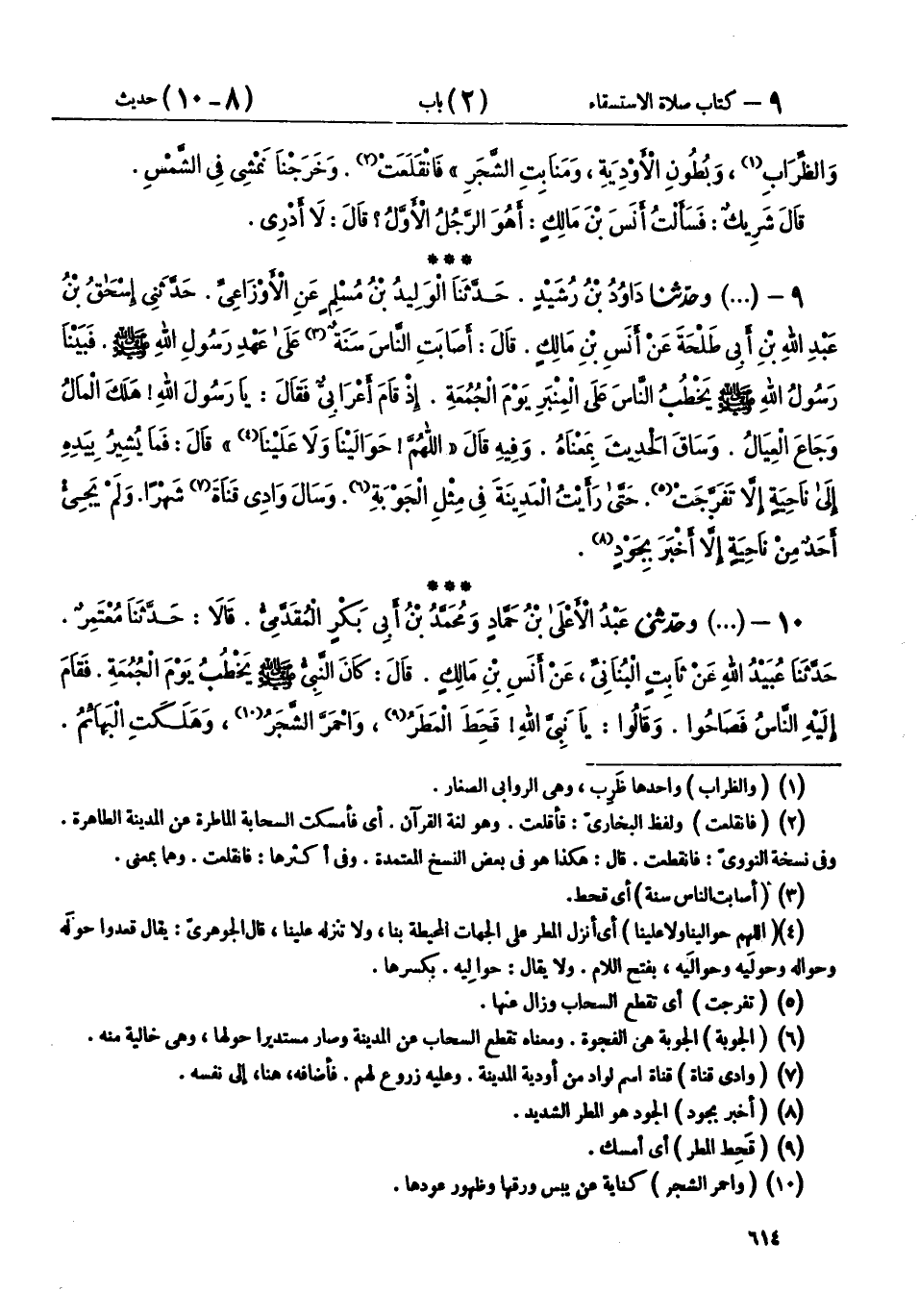 9 - (897) وحَدَّثَنَا دَاوُدُ بْنُ رُشَيْدٍ، حَدَّثَنَا الْوَلِيدُ بْنُ مُسْلِمٍ، عَنِ الْأَوْزَاعِيِّ، حَدَّثَنِي إِسْحَاقُ بْنُ عَبْدِ اللهِ بْنِ أَبِي طَلْحَةَ، عَنْ أَنَسِ بْنِ مَالِكٍ، قَالَ: أَصَابَتِ النَّاسَ سَنَةٌ عَلَى عَهْدِ رَسُولِ اللهِ صَلَّى اللهُ عَلَيْهِ وَسَلَّمَ، فَبَيْنَا رَسُولُ اللهِ صَلَّى اللهُ عَلَيْهِ وَسَلَّمَ يَخْطُبُ النَّاسَ عَلَى الْمِنْبَرِ يَوْمَ الْجُمُعَةِ، إِذْ قَامَ أَعْرَابِيٌّ، فَقَالَ يَا رَسُولَ اللهِ هَلَكَ الْمَالُ، وَجَاعَ الْعِيَالُ، وَسَاقَ الْحَدِيثَ بِمَعْنَاهُ، وَفِيهِ قَالَ «اللهُمَّ حَوَالَيْنَا وَلَا عَلَيْنَا»، قَالَ: فَمَا يُشِيرُ بِيَدِهِ إِلَى نَاحِيَةٍ إِلَّا تَفَرَّجَتْ، حَتَّى رَأَيْتُ الْمَدِينَةَ فِي مِثْلِ الْجَوْبَةِ وَسَالَ وَادِي قَنَاةَ شَهْرًا، وَلَمْ يَجِئْ أَحَدٌ مِنْ نَاحِيَةٍ إِلَّا أَخْبَرَ بِجَوْدٍ.