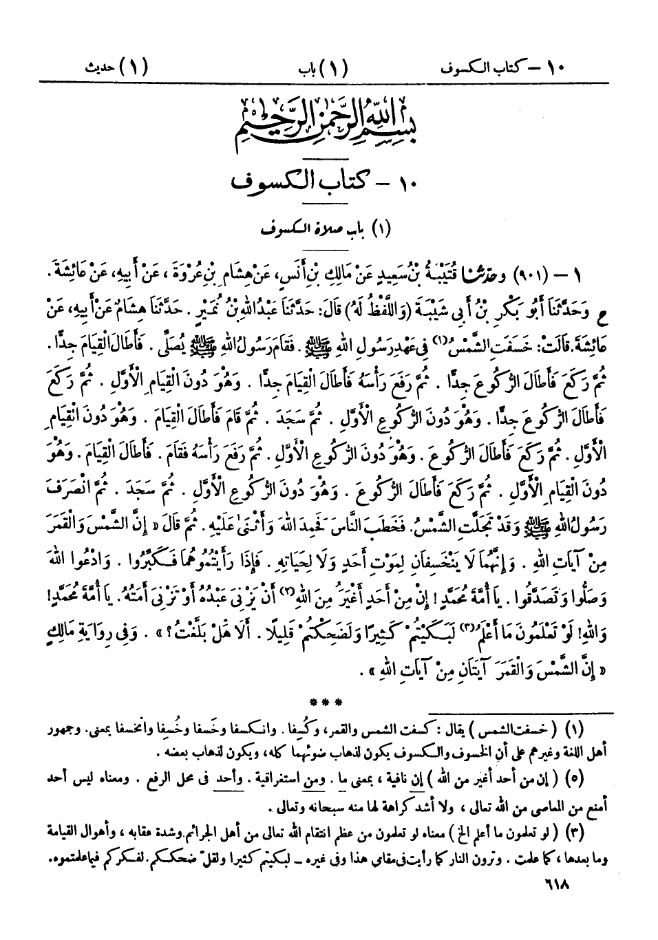 1 - (901) وحَدَّثَنَا قُتَيْبَةُ بْنُ سَعِيدٍ، عَنْ مَالِكِ بْنِ أَنَسٍ، عَنْ هِشَامِ بْنِ عُرْوَةَ، عَنْ أَبِيهِ، عَنْ عَائِشَةَ، ح وحَدَّثَنَا أَبُو بَكْرِ بْنُ أَبِي شَيْبَةَ، وَاللَّفْظُ لَهُ، قَالَ: حَدَّثَنَا عَبْدُ اللهِ بْنُ نُمَيْرٍ، حَدَّثَنَا هِشَامٌ، عَنْ أَبِيهِ، عَنْ عَائِشَةَ، قَالَتْ: خَسَفَتِ الشَّمْسُ فِي عَهْدِ رَسُولِ اللهِ صَلَّى اللهُ عَلَيْهِ وَسَلَّمَ، فَقَامَ رَسُولُ اللهِ صَلَّى اللهُ عَلَيْهِ وَسَلَّمَ يُصَلِّي، فَأَطَالَ الْقِيَامَ جِدًّا، ثُمَّ رَكَعَ، فَأَطَالَ الرُّكُوعَ جِدًّا، ثُمَّ رَفَعَ رَأْسَهُ، فَأَطَالَ الْقِيَامَ جِدًّا، وَهُوَ دُونَ الْقِيَامِ الْأَوَّلِ، ثُمَّ رَكَعَ فَأَطَالَ الرُّكُوعَ جِدًّا، وَهُوَ دُونَ الرُّكُوعِ الْأَوَّلِ، ثُمَّ سَجَدَ، ثُمَّ قَامَ، فَأَطَالَ الْقِيَامَ، وَهُوَ دُونَ الْقِيَامِ الْأَوَّلِ، ثُمَّ رَكَعَ، فَأَطَالَ الرُّكُوعَ وَهُوَ دُونَ الرُّكُوعِ الْأَوَّلِ، ثُمَّ رَفَعَ رَأْسَهُ، فَقَامَ فَأَطَالَ الْقِيَامَ وَهُوَ دُونَ الْقِيَامِ الْأَوَّلِ، ثُمَّ رَكَعَ، فَأَطَالَ الرُّكُوعَ وَهُوَ دُونَ الرُّكُوعِ الْأَوَّلِ، ثُمَّ سَجَدَ، ثُمَّ انْصَرَفَ رَسُولُ اللهِ صَلَّى اللهُ عَلَيْهِ وَسَلَّمَ، وَقَدْ تَجَلَّتِ الشَّمْسُ، فَخَطَبَ النَّاسَ، فَحَمِدَ اللهَ وَأَثْنَى عَلَيْهِ، ثُمَّ قَالَ: «إِنَّ §الشَّمْسَ وَالْقَمَرَ مِنْ آيَاتِ اللهِ، وَإِنَّهُمَا لَا يَنْخَسِفَانِ لِمَوْتِ أَحَدٍ، وَلَا لِحَيَاتِهِ، فَإِذَا رَأَيْتُمُوهُمَا فَكَبِّرُوا، وَادْعُوا اللهَ وَصَلُّوا وَتَصَدَّقُوا، يَا أُمَّةَ مُحَمَّدٍ إِنْ مِنْ أَحَدٍ أَغْيَرَ مِنَ اللهِ أَنْ يَزْنِيَ عَبْدُهُ، أَوْ تَزْنِيَ أَمَتُهُ، يَا أُمَّةَ مُحَمَّدٍ وَاللهِ لَوْ تَعْلَمُونَ مَا أَعْلَمُ لَبَكَيْتُمْ كَثِيرًا، وَلَضَحِكْتُمْ قَلِيلًا، أَلَا هَلْ بَلَّغْتُ؟». وَفِي رِوَايَةِ مَالِكٍ: «إِنَّ الشَّمْسَ وَالْقَمَرَ آيَتَانِ مِنْ آيَاتِ اللهِ».