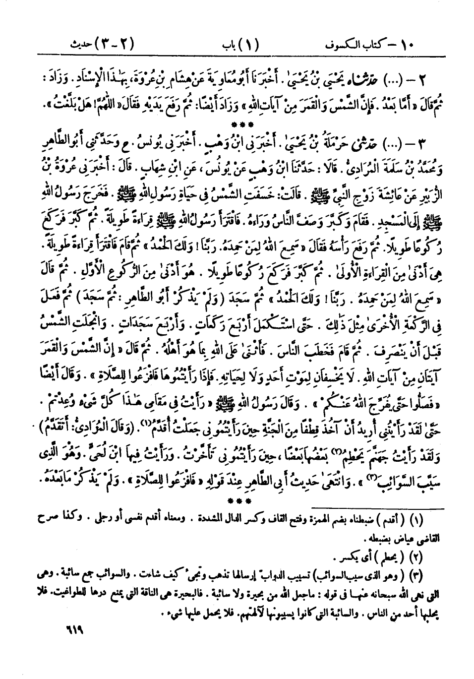 3 - (901) حَدَّثَنِي حَرْمَلَةُ بْنُ يَحْيَى، أَخْبَرَنِي ابْنُ وَهْبٍ، أَخْبَرَنِي يُونُسُ، ح وحَدَّثَنِي أَبُو الطَّاهِرِ، وَمُحَمَّدُ بْنُ سَلَمَةَ الْمُرَادِيُّ، قَالَا: حَدَّثَنَا ابْنُ وَهْبٍ، عَنْ يُونُسَ، عَنِ ابْنِ شِهَابٍ، قَالَ: أَخْبَرَنِي عُرْوَةُ بْنُ الزُّبَيْرِ، عَنْ عَائِشَةَ، زَوْجِ النَّبِيِّ صَلَّى اللهُ عَلَيْهِ وَسَلَّمَ، قَالَتْ: خَسَفَتِ الشَّمْسُ فِي حَيَاةِ رَسُولِ اللهِ صَلَّى اللهُ عَلَيْهِ وَسَلَّمَ، فَخَرَجَ رَسُولُ اللهِ صَلَّى اللهُ عَلَيْهِ وَسَلَّمَ إِلَى الْمَسْجِدِ، فَقَامَ وَكَبَّرَ، وَصَفَّ النَّاسُ وَرَاءَهُ، فَاقْتَرَأَ رَسُولُ اللهِ صَلَّى اللهُ عَلَيْهِ وَسَلَّمَ قِرَاءَةً طَوِيلَةً، ثُمَّ كَبَّرَ فَرَكَعَ رُكُوعًا طَوِيلًا، ثُمَّ رَفَعَ رَأْسَهُ، فَقَالَ: «سَمِعَ اللهُ لِمَنْ حَمِدَهُ، رَبَّنَا وَلَكَ الْحَمْدُ»، ثُمَّ قَامَ، فَاقْتَرَأَ قِرَاءَةً طَوِيلَةً هِيَ أَدْنَى مِنَ الْقِرَاءَةِ الْأُولَى، ثُمَّ كَبَّرَ، فَرَكَعَ رُكُوعًا طَوِيلًا هُوَ أَدْنَى مِنَ الرُّكُوعِ الْأَوَّلِ، ثُمَّ قَالَ: «سَمِعَ اللهُ لِمَنْ حَمِدَهُ، رَبَّنَا وَلَكَ الْحَمْدُ»، ثُمَّ سَجَدَ - وَلَمْ يَذْكُرْ أَبُو الطَّاهِرِ: ثُمَّ سَجَدَ - ثُمَّ فَعَلَ فِي الرَّكْعَةِ الْأُخْرَى مِثْلَ ذَلِكَ، حَتَّى اسْتَكْمَلَ أَرْبَعَ رَكَعَاتٍ، وَأَرْبَعَ سَجَدَاتٍ، وَانْجَلَتِ الشَّمْسُ قَبْلَ أَنْ يَنْصَرِفَ، ثُمَّ قَامَ فَخَطَبَ النَّاسَ، فَأَثْنَى عَلَى اللهِ بِمَا هُوَ أَهْلُهُ، ثُمَّ قَالَ: «إِنَّ §الشَّمْسَ وَالْقَمَرَ آيَتَانِ مِنْ آيَاتِ اللهِ، لَا يَخْسِفَانِ لِمَوْتِ أَحَدٍ، وَلَا لِحَيَاتِهِ، فَإِذَا رَأَيْتُمُوهَا فَافْزَعُوا لِلصَّلَاةِ»، وَقَالَ أَيْضًا: «فَصَلُّوا حَتَّى يُفَرِّجَ اللهُ عَنْكُمْ»، وَقَالَ رَسُولُ اللهِ صَلَّى اللهُ عَلَيْهِ وَسَلَّمَ: " رَأَيْتُ فِي مَقَامِي هَذَا كُلَّ شَيْءٍ وُعِدْتُمْ، حَتَّى لَقَدْ رَأَيْتُنِي أُرِيدُ أَنْ آخُذَ قِطْفًا مِنَ الْجَنَّةِ حِينَ رَأَيْتُمُونِي جَعَلْتُ أُقَدِّمُ - وقَالَ الْمُرَادِيُّ: أَتَقَدَّمُ - وَلَقَدْ رَأَيْتُ جَهَنَّمَ يَحْطِمُ بَعْضُهَا بَعْضًا، حِينَ رَأَيْتُمُونِي تَأَخَّرْتُ، وَرَأَيْتُ فِيهَا ابْنَ لُحَيٍّ، وَهُوَ الَّذِي سَيَّبَ السَّوَائِبَ «. وَانْتَهَى حَدِيثُ أَبِي الطَّاهِرِ عِنْدَ قَوْلِهِ» فَافْزَعُوا لِلصَّلَاةِ "، وَلَمْ يَذْكُرْ مَا بَعْدَهُ