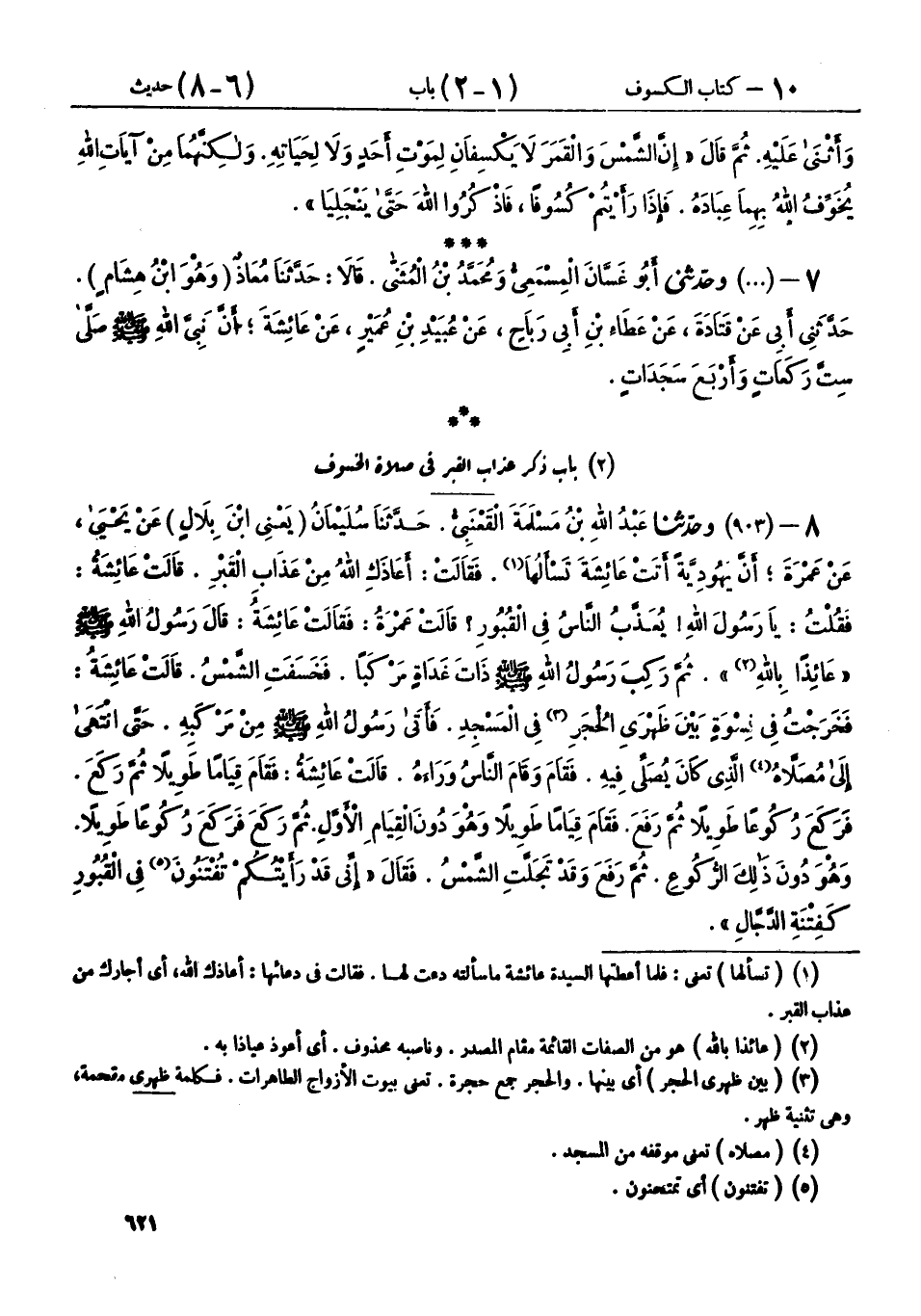 ثُمَّ رَكِبَ رَسُولُ اللهِ صَلَّى اللهُ عَلَيْهِ وَسَلَّمَ ذَاتَ غَدَاةٍ مَرْكَبًا، فَخَسَفَتِ الشَّمْسُ، قَالَتْ عَائِشَةُ: فَخَرَجْتُ فِي نِسْوَةٍ بَيْنَ ظَهْرَيِ الْحُجَرِ فِي الْمَسْجِدِ، فَأَتَى رَسُولُ اللهِ صَلَّى اللهُ عَلَيْهِ وَسَلَّمَ مِنْ مَرْكَبِهِ، حَتَّى انْتَهَى إِلَى مُصَلَّاهُ الَّذِي كَانَ يُصَلِّي فِيهِ، فَقَامَ وَقَامَ النَّاسُ وَرَاءَهُ، قَالَتْ عَائِشَةُ: فَقَامَ قِيَامًا طَوِيلًا، ثُمَّ رَكَعَ، فَرَكَعَ رُكُوعًا طَوِيلًا، ثُمَّ رَفَعَ، فَقَامَ قِيَامًا طَوِيلًا وَهُوَ دُونَ الْقِيَامِ الْأَوَّلِ، ثُمَّ رَكَعَ، فَرَكَعَ رُكُوعًا طَوِيلًا، وَهُوَ دُونَ ذَلِكَ الرُّكُوعِ، ثُمَّ رَفَعَ وَقَدْ تَجَلَّتِ الشَّمْسُ، فَقَالَ: «إِنِّي قَدْ رَأَيْتُكُمْ تُفْتَنُونَ فِي الْقُبُورِ كَفِتْنَةِ الدَّجَّالِ» قَالَتْ عَمْرَةُ: فَسَمِعْتُ عَائِشَةَ، تَقُولُ: فَكُنْتُ أَسْمَعُ رَسُولَ اللهِ صَلَّى اللهُ عَلَيْهِ وَسَلَّمَ بَعْدَ ذَلِكَ، يَتَعَوَّذُ مِنْ عَذَابِ النَّارِ، وَعَذَابِ الْقَبْرِ.