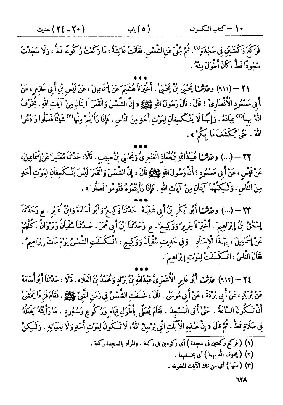 21 - (911) حَدَّثَنَا يَحْيَى بْنُ يَحْيَى، أَخْبَرَنَا هُشَيْمٌ، عَنْ إِسْمَاعِيلَ، عَنْ قَيْسِ بْنِ أَبِي حَازِمٍ، عَنْ أَبِي مَسْعُودٍ الْأَنْصَارِيِّ، قَالَ: قَالَ رَسُولُ اللهِ صَلَّى اللهُ عَلَيْهِ وَسَلَّمَ: إِنَّ §الشَّمْسَ وَالْقَمَرَ آيَتَانِ مِنْ آيَاتِ اللهِ، يُخَوِّفُ اللهُ بِهِمَا عِبَادَهُ، وَإِنَّهُمَا لَا يَنْكَسِفَانِ لِمَوْتِ أَحَدٍ مِنَ النَّاسِ، فَإِذَا رَأَيْتُمْ مِنْهَا شَيْئًا فَصَلُّوا، وَادْعُوا اللهَ حَتَّى يُكْشَفَ مَا بِكُمْ "