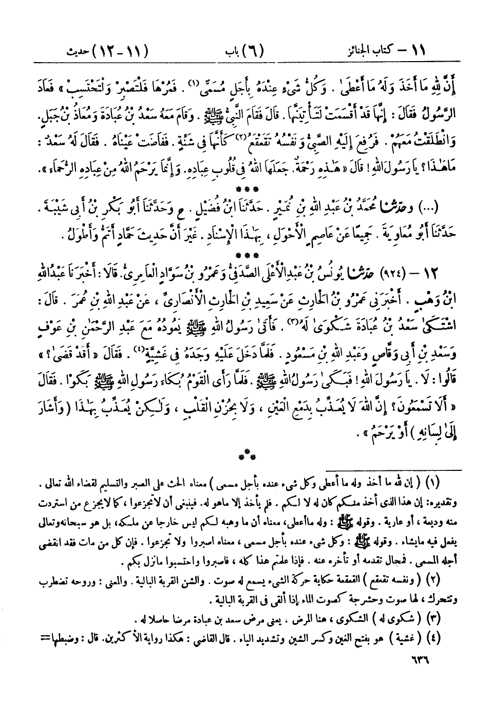12 - (924) حَدَّثَنَا يُونُسُ بْنُ عَبْدِ الْأَعْلَى الصَّدَفِيُّ، وَعَمْرُو بْنُ سَوَّادٍ الْعَامِرِيُّ، قَالَا: أَخْبَرَنَا عَبْدُ اللهِ بْنُ وَهْبٍ، أَخْبَرَنِي عَمْرُو بْنُ الْحَارِثِ، عَنْ سَعِيدِ بْنِ الْحَارِثِ الْأَنْصَارِيِّ، عَنْ عَبْدِ اللهِ بْنِ عُمَرَ، قَالَ: اشْتَكَى سَعْدُ بْنُ عُبَادَةَ شَكْوَى لَهُ، فَأَتَى رَسُولُ اللهِ صَلَّى اللهُ عَلَيْهِ وَسَلَّمَ يَعُودُهُ مَعَ عَبْدِ الرَّحْمَنِ بْنِ عَوْفٍ، وَسَعْدِ بْنِ أَبِي وَقَّاصٍ، وَعَبْدِ اللهِ بْنِ مَسْعُودٍ، فَلَمَّا دَخَلَ عَلَيْهِ وَجَدَهُ فِي غَشِيَّةٍ، فَقَالَ: «أَقَدْ قَضَى؟» قَالُوا: لَا، يَا رَسُولَ اللهِ فَبَكَى رَسُولُ اللهِ صَلَّى اللهُ عَلَيْهِ وَسَلَّمَ، فَلَمَّا رَأَى الْقَوْمُ بُكَاءَ رَسُولِ اللهِ صَلَّى اللهُ عَلَيْهِ وَسَلَّمَ بَكَوْا، فَقَالَ: «أَلَا تَسْمَعُونَ؟ إِنَّ §اللهَ لَا يُعَذِّبُ بِدَمْعِ الْعَيْنِ، وَلَا بِحُزْنِ الْقَلْبِ، وَلَكِنْ يُعَذِّبُ بِهَذَا - وَأَشَارَ إِلَى لِسَانِهِ - أَوْ يَرْحَمُ»