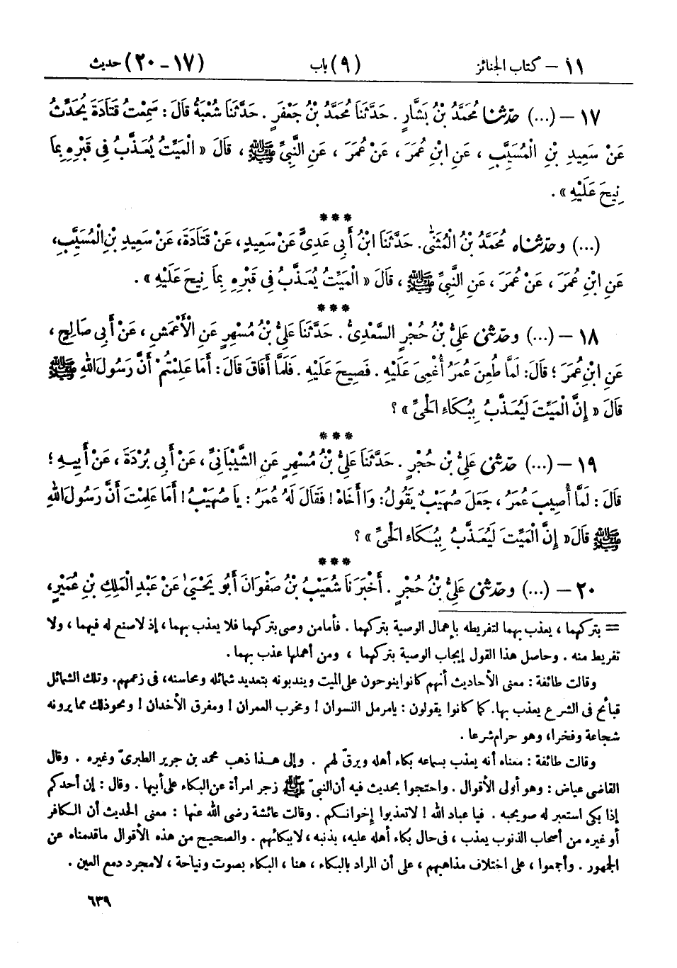 17 - (927) حَدَّثَنَا مُحَمَّدُ بْنُ بَشَّارٍ، حَدَّثَنَا مُحَمَّدُ بْنُ جَعْفَرٍ، حَدَّثَنَا شُعْبَةُ، قَالَ: سَمِعْتُ قَتَادَةَ، يُحَدِّثُ عَنْ سَعِيدِ بْنِ الْمُسَيِّبِ، عَنِ ابْنِ عُمَرَ، عَنْ عُمَرَ، عَنِ النَّبِيِّ صَلَّى اللهُ عَلَيْهِ وَسَلَّمَ، قَالَ: «§الْمَيِّتُ يُعَذَّبُ فِي قَبْرِهِ بِمَا نِيحَ عَلَيْهِ»