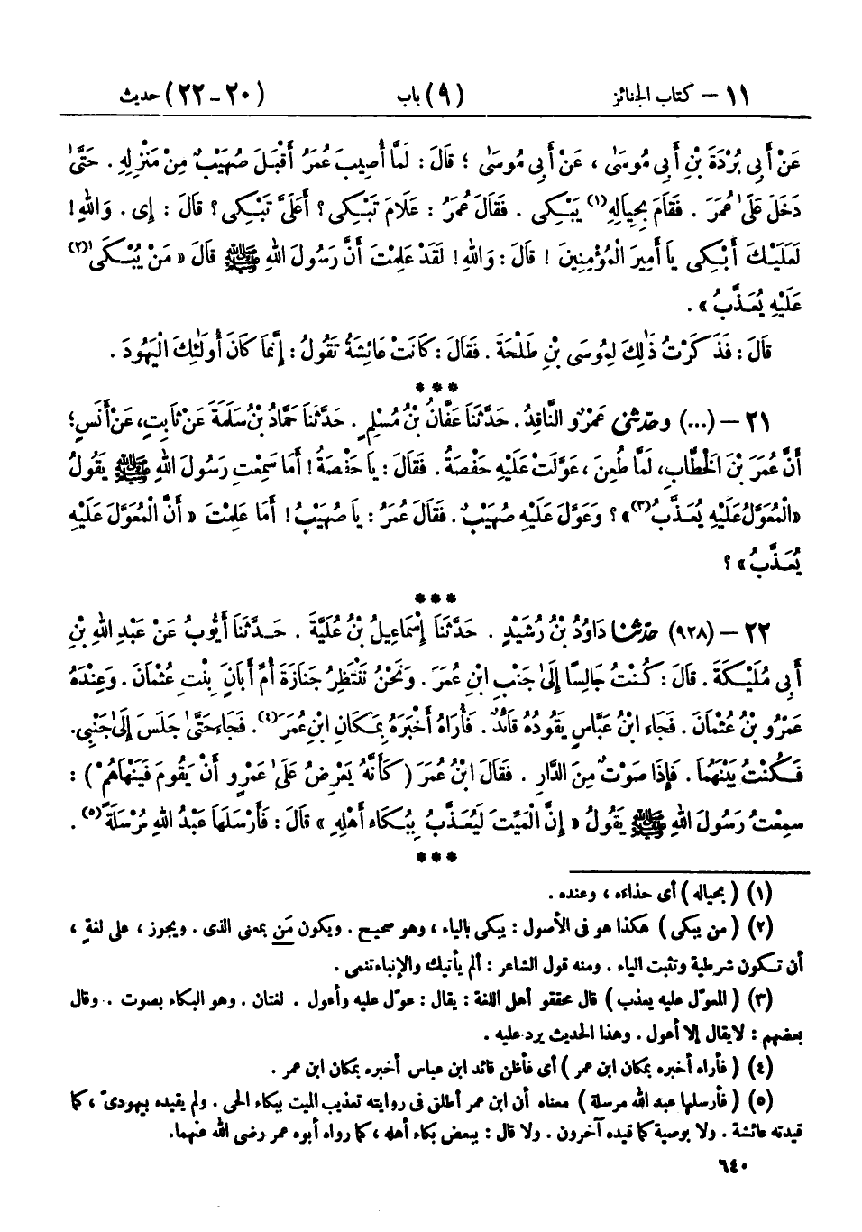 22 - (928) حَدَّثَنَا دَاوُدُ بْنُ رُشَيْدٍ، حَدَّثَنَا إِسْمَاعِيلُ ابْنُ عُلَيَّةَ، حَدَّثَنَا أَيُّوبُ، عَنْ عَبْدِ اللهِ بْنِ أَبِي مُلَيْكَةَ، قَالَ: كُنْتُ جَالِسًا إِلَى جَنْبِ ابْنِ عُمَرَ، وَنَحْنُ نَنْتَظِرُ جَنَازَةَ أُمِّ أَبَانَ بِنْتِ عُثْمَانَ، وَعِنْدَهُ عَمْرُو بْنُ عُثْمَانَ، فَجَاءَ ابْنُ عَبَّاسٍ يَقُودُهُ قَائِدٌ، فَأُرَاهُ أَخْبَرَهُ بِمَكَانِ ابْنِ عُمَرَ، فَجَاءَ حَتَّى جَلَسَ إِلَى جَنْبِي، فَكُنْتُ بَيْنَهُمَا، فَإِذَا صَوْتٌ مِنَ الدَّارِ، فَقَالَ ابْنُ عُمَرَ - كَأَنَّهُ يَعْرِضُ عَلَى عَمْرٍو أَنْ يَقُومَ، فَيَنْهَاهُمْ -: سَمِعْتُ رَسُولَ اللهِ صَلَّى اللهُ عَلَيْهِ وَسَلَّمَ يَقُولُ: «إِنَّ الْمَيِّتَ لَيُعَذَّبُ بِبُكَاءِ أَهْلِهِ»، قَالَ: فَأَرْسَلَهَا عَبْدُ اللهِ مُرْسَلَةً،