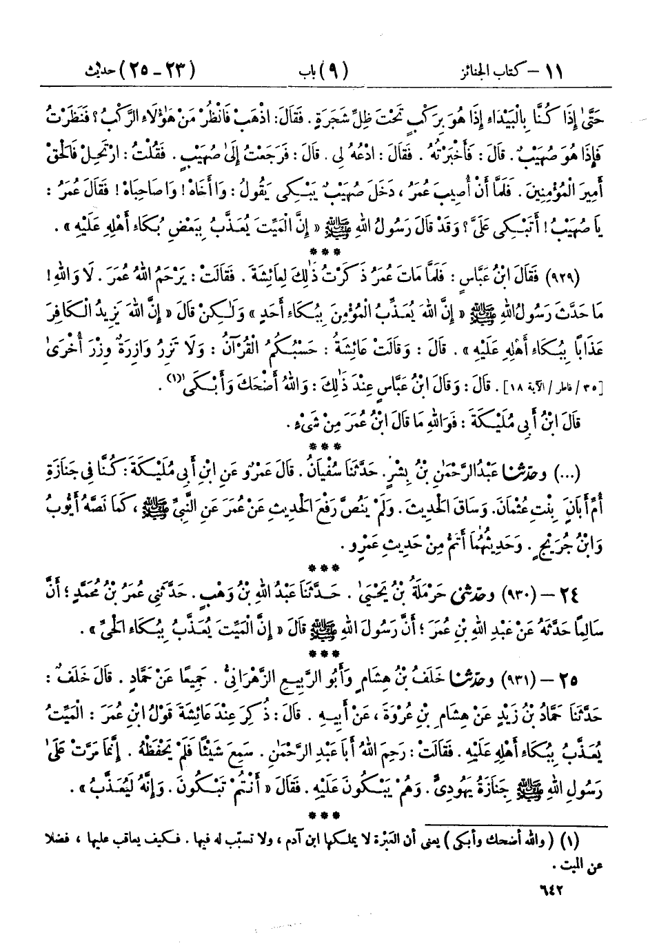 25 - (931) وحَدَّثَنَا خَلَفُ بْنُ هِشَامٍ، وَأَبُو الرَّبِيعِ الزَّهْرَانِيُّ، جَمِيعًا عَنْ حَمَّادٍ، قَالَ خَلَفٌ: حَدَّثَنَا حَمَّادُ بْنُ زَيْدٍ، عَنْ هِشَامِ بْنِ عُرْوَةَ، عَنْ أَبِيهِ، قَالَ: ذُكِرَ عِنْدَ عَائِشَةَ قَوْلُ ابْنِ عُمَرَ: الْمَيِّتُ يُعَذَّبُ بِبُكَاءِ أَهْلِهِ عَلَيْهِ، فَقَالَتْ: رَحِمَ اللهُ أَبَا عَبْدِ الرَّحْمَنِ، سَمِعَ شَيْئًا فَلَمْ يَحْفَظْهُ، إِنَّمَا مَرَّتْ عَلَى رَسُولِ اللهِ صَلَّى اللهُ عَلَيْهِ وَسَلَّمَ جَنَازَةُ يَهُودِيٍّ، وَهُمْ يَبْكُونَ عَلَيْهِ، فَقَالَ: «§أَنْتُمْ تَبْكُونَ، وَإِنَّهُ لَيُعَذَّبُ»