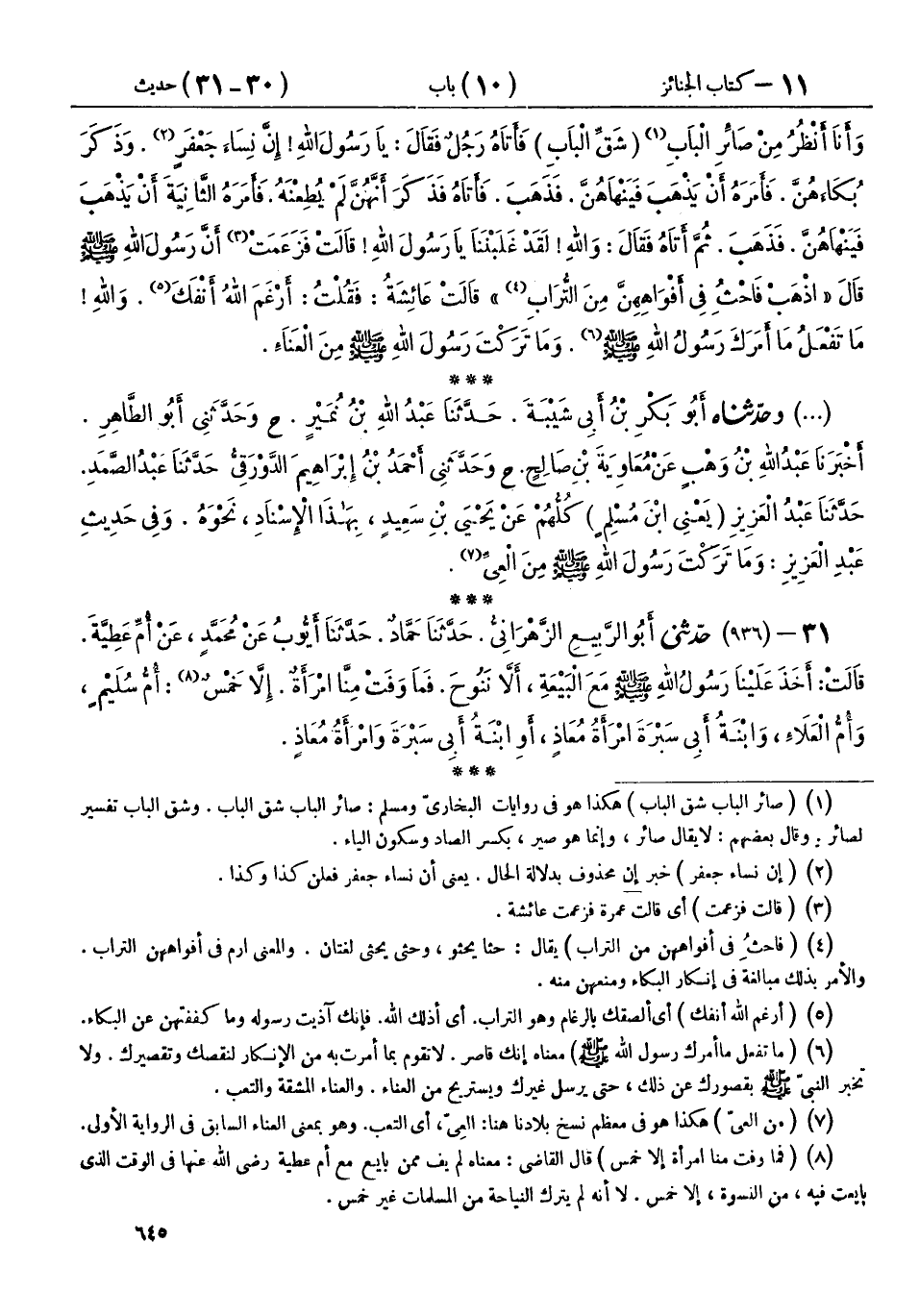 31 - (936) حَدَّثَنِي أَبُو الرَّبِيعِ الزَّهْرَانِيُّ، حَدَّثَنَا حَمَّادٌ، حَدَّثَنَا أَيُّوبُ، عَنْ مُحَمَّدٍ، عَنْ أُمِّ عَطِيَّةَ، قَالَتْ: «§أَخَذَ عَلَيْنَا رَسُولُ اللهِ صَلَّى اللهُ عَلَيْهِ وَسَلَّمَ مَعَ الْبَيْعَةِ، أَلَّا نَنُوحَ»، فَمَا وَفَتْ مِنَّا امْرَأَةٌ، إِلَّا خَمْسٌ: أُمُّ سُلَيْمٍ، وَأُمُّ الْعَلَاءِ، وَابْنَةُ أَبِي سَبْرَةَ، امْرَأَةُ مُعَاذٍ، أَوْ ابْنَةُ أَبِي سَبْرَةَ، وَامْرَأَةُ مُعَاذٍ