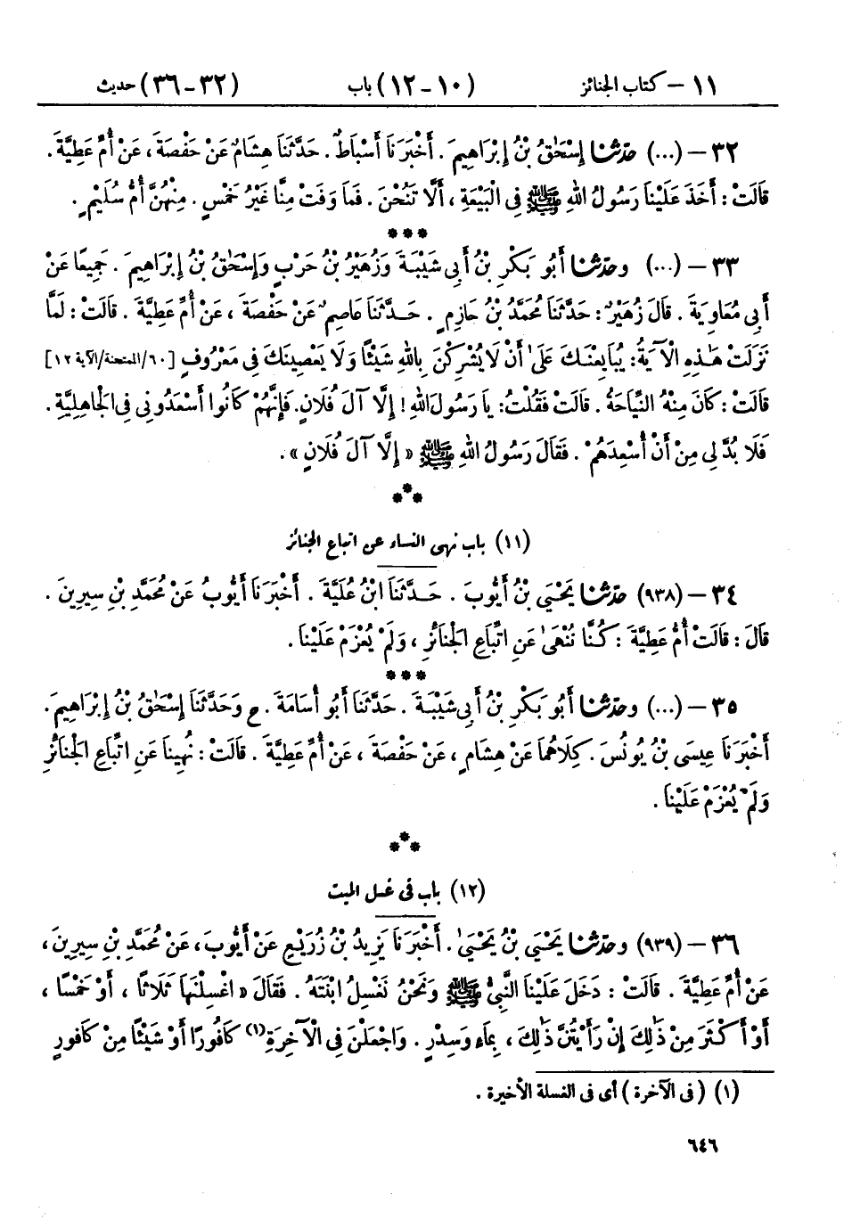 32 - (936) حَدَّثَنَا إِسْحَاقُ بْنُ إِبْرَاهِيمَ، أَخْبَرَنَا أَسْبَاطٌ، حَدَّثَنَا هِشَامٌ، عَنْ حَفْصَةَ، عَنْ أُمِّ عَطِيَّةَ، قَالَتْ: «§أَخَذَ عَلَيْنَا رَسُولُ اللهِ صَلَّى اللهُ عَلَيْهِ وَسَلَّمَ فِي الْبَيْعَةِ أَلَّا تَنُحْنَ، فَمَا وَفَتْ مِنَّا غَيْرُ خَمْسٍ، مِنْهُنَّ أُمُّ سُلَيْمٍ»