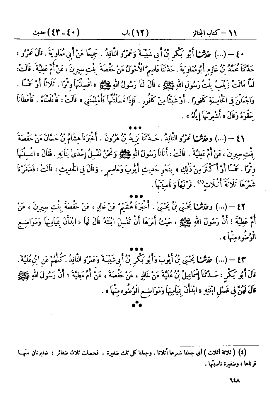 43 - (939) حَدَّثَنَا يَحْيَى بْنُ أَيُّوبَ، وَأَبُو بَكْرِ بْنُ أَبِي شَيْبَةَ، وَعَمْرٌو النَّاقِدُ، كُلُّهُمْ عَنِ ابْنِ عُلَيَّةَ، قَالَ أَبُو بَكْرٍ: حَدَّثَنَا إِسْمَاعِيلُ ابْنُ عُلَيَّةَ، عَنْ خَالِدٍ، عَنْ حَفْصَةَ، عَنْ أُمِّ عَطِيَّةَ، أَنَّ رَسُولَ اللهِ صَلَّى اللهُ عَلَيْهِ وَسَلَّمَ قَالَ لَهُنَّ فِي غَسْلِ ابْنَتِهِ: «§ابْدَأْنَ بِمَيَامِنِهَا، وَمَوَاضِعِ الْوُضُوءِ مِنْهَا»