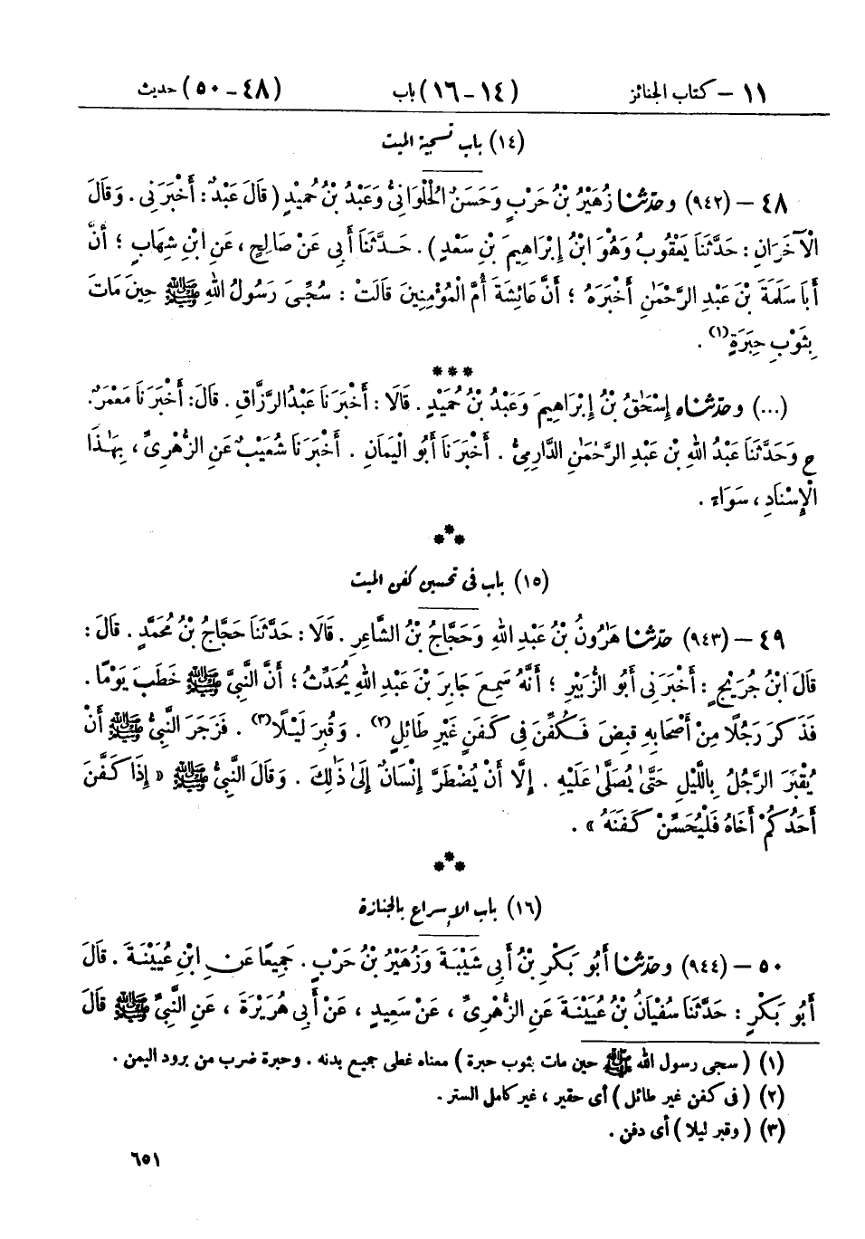 48 - (942) وحَدَّثَنَا زُهَيْرُ بْنُ حَرْبٍ، وَحَسَنٌ الْحُلْوَانِيُّ، وَعَبْدُ بْنُ حُمَيْدٍ، قَالَ عَبْدٌ: أَخْبَرَنِي، وقَالَ الْآخَرَانِ: حَدَّثَنَا يَعْقُوبُ وَهُوَ ابْنُ إِبْرَاهِيمَ بْنِ سَعْدٍ، حَدَّثَنَا أَبِي، عَنْ صَالِحٍ، عَنِ ابْنِ شِهَابٍ، أَنَّ أَبَا سَلَمَةَ بْنَ عَبْدِ الرَّحْمَنِ، أَخْبَرَهُ أَنَّ عَائِشَةَ أُمَّ الْمُؤْمِنِينَ قَالَتْ: «§سُجِّيَ رَسُولُ اللهِ صَلَّى اللهُ عَلَيْهِ وَسَلَّمَ حِينَ مَاتَ بِثَوْبِ حِبَرَةٍ»