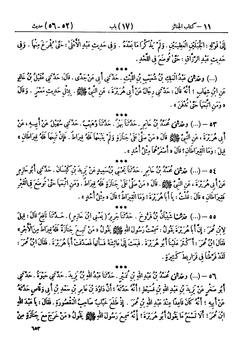 55 - (945) حَدَّثَنَا شَيْبَانُ بْنُ فَرُّوخَ، حَدَّثَنَا جَرِيرٌ يَعْنِي ابْنَ حَازِمٍ، حَدَّثَنَا نَافِعٌ، قَالَ: قِيلَ لِابْنِ عُمَرَ: إِنَّ أَبَا هُرَيْرَةَ يَقُولُ: سَمِعْتُ رَسُولَ اللهِ صَلَّى اللهُ عَلَيْهِ وَسَلَّمَ يَقُولُ: «§مَنْ تَبِعَ جَنَازَةً فَلَهُ قِيرَاطٌ مِنَ الْأَجْرِ» فَقَالَ ابْنُ عُمَرَ: أَكْثَرَ عَلَيْنَا أَبُو هُرَيْرَةَ، فَبَعَثَ إِلَى عَائِشَةَ، فَسَأَلَهَا، فَصَدَّقَتْ أَبَا هُرَيْرَةَ فَقَالَ ابْنُ عُمَرَ: «لَقَدْ فَرَّطْنَا فِي قَرَارِيطَ كَثِيرَةٍ»