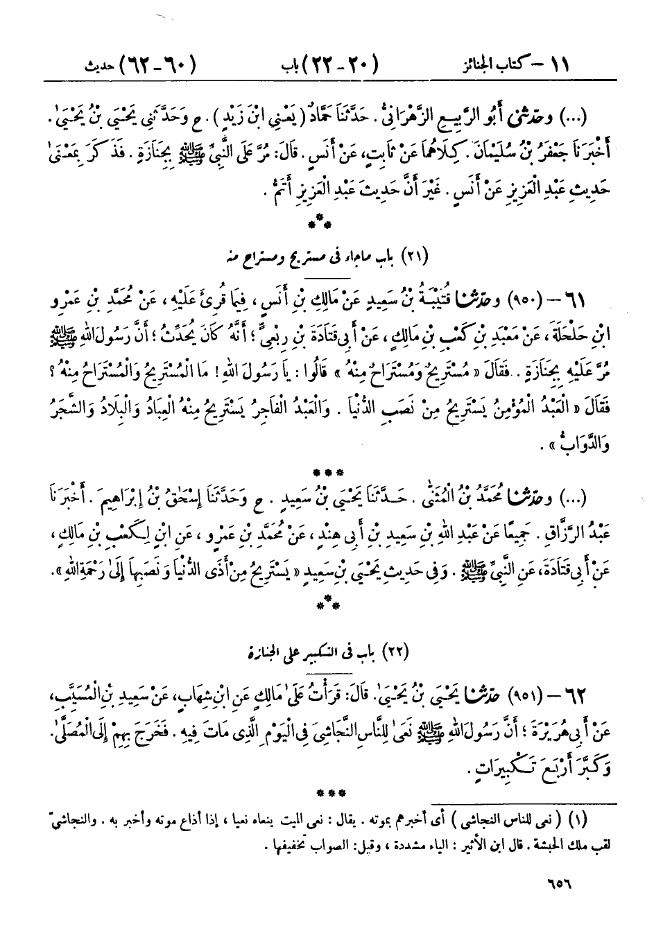 62 - (951) حَدَّثَنَا يَحْيَى بْنُ يَحْيَى، قَالَ: قَرَأْتُ عَلَى مَالِكٍ، عَنِ ابْنِ شِهَابٍ، عَنْ سَعِيدِ بْنِ الْمُسَيِّبِ، عَنْ أَبِي هُرَيْرَةَ، «أَنَّ رَسُولَ اللهِ صَلَّى اللهُ عَلَيْهِ وَسَلَّمَ §نَعَى لِلنَّاسِ النَّجَاشِيَ فِي الْيَوْمِ الَّذِي مَاتَ فِيهِ، فَخَرَجَ بِهِمْ إِلَى الْمُصَلَّى، وَكَبَّرَ أَرْبَعَ تَكْبِيرَاتٍ»