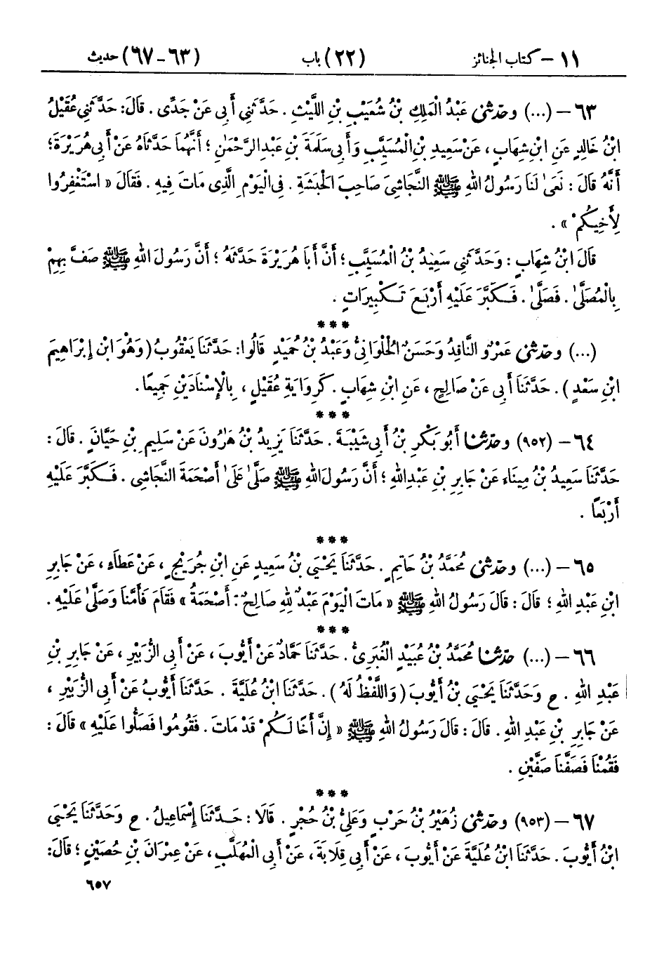 67 - (953) وحَدَّثَنِي زُهَيْرُ بْنُ حَرْبٍ، وَعَلِيُّ بْنُ حُجْرٍ، قَالَا: حَدَّثَنَا إِسْمَاعِيلُ، ح وحَدَّثَنَا يَحْيَى بْنُ أَيُّوبَ، حَدَّثَنَا ابْنُ عُلَيَّةَ، عَنْ أَيُّوبَ، عَنْ أَبِي قِلَابَةَ، عَنْ أَبِي الْمُهَلَّبِ، عَنْ عِمْرَانَ بْنِ حُصَيْنٍ، قَالَ: قَالَ رَسُولُ اللهِ: «إِنَّ §أَخًا لَكُمْ قَدْ مَاتَ، فَقُومُوا فَصَلُّوا عَلَيْهِ» يَعْنِي النَّجَاشِيَ، وَفِي رِوَايَةِ زُهَيْرٍ: «إِنَّ أَخَاكُمْ»