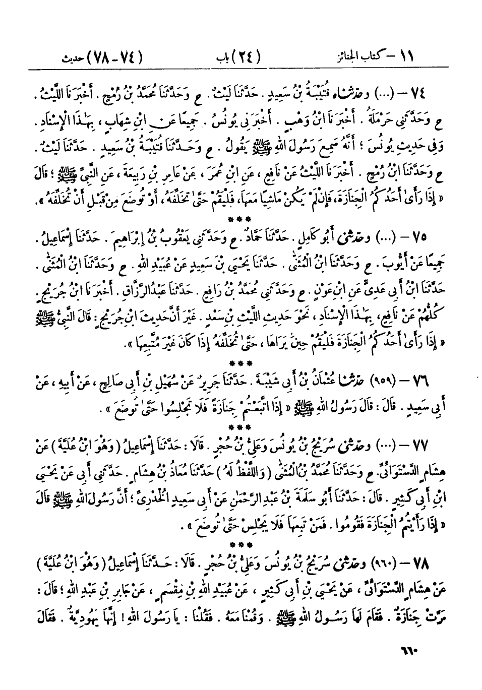 75 - (958) وحَدَّثَنِي أَبُو كَامِلٍ، حَدَّثَنَا حَمَّادٌ، ح وحَدَّثَنِي يَعْقُوبُ بْنُ إِبْرَاهِيمَ، حَدَّثَنَا إِسْمَاعِيلُ، جَمِيعًا عَنْ أَيُّوبَ، ح وحَدَّثَنَا ابْنُ الْمُثَنَّى، حَدَّثَنَا يَحْيَى بْنُ سَعِيدٍ، عَنْ عُبَيْدِ اللهِ، ح وحَدَّثَنَا ابْنُ الْمُثَنَّى، حَدَّثَنَا ابْنُ أَبِي عَدِيٍّ، عَنِ ابْنِ عَوْنٍ، ح وحَدَّثَنِي مُحَمَّدُ بْنُ رَافِعٍ، حَدَّثَنَا عَبْدُ الرَّزَّاقِ، أَخْبَرَنَا ابْنُ جُرَيْجٍ، كُلُّهُمْ عَنْ نَافِعٍ، بِهَذَا الْإِسْنَادِ نَحْوَ حَدِيثِ اللَّيْثِ بْنِ سَعْدٍ غَيْرَ أَنَّ حَدِيثَ ابْنِ جُرَيْجٍ، قَالَ النَّبِيُّ صَلَّى اللهُ عَلَيْهِ وَسَلَّمَ: «§إِذَا رَأَى أَحَدُكُمُ الْجَنَازَةَ، فَلْيَقُمْ حِينَ يَرَاهَا حَتَّى تُخَلِّفَهُ، إِذَا كَانَ غَيْرَ مُتَّبِعِهَا»