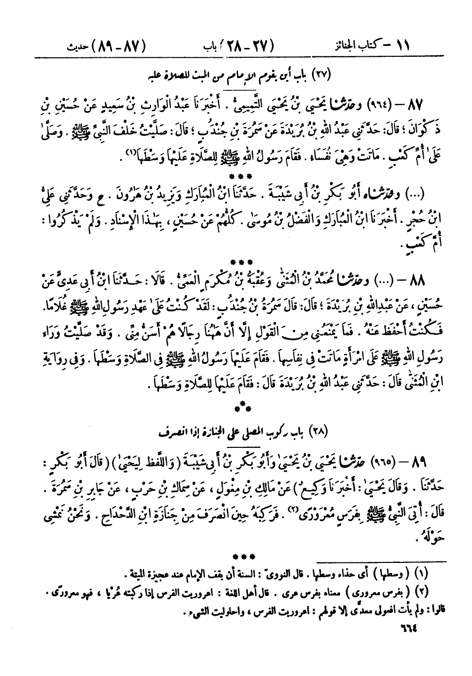 88 - (964) وحَدَّثَنَا مُحَمَّدُ بْنُ الْمُثَنَّى، وَعُقْبَةُ بْنُ مُكْرَمٍ الْعَمِّيُّ، قَالَا: حَدَّثَنَا ابْنُ أَبِي عَدِيٍّ، عَنْ حُسَيْنٍ، عَنْ عَبْدِ اللهِ بْنِ بُرَيْدَةَ، قَالَ: قَالَ سَمُرَةُ بْنُ جُنْدُبٍ: لَقَدْ كُنْتُ عَلَى عَهْدِ رَسُولِ اللهِ صَلَّى اللهُ عَلَيْهِ وَسَلَّمَ غُلَامًا، فَكُنْتُ أَحْفَظُ عَنْهُ، فَمَا يَمْنَعُنِي مِنَ الْقَوْلِ إِلَّا أَنَّ هَا هُنَا رِجَالًا هُمْ أَسَنُّ مِنِّي، وَقَدْ «§صَلَّيْتُ وَرَاءَ رَسُولِ اللهِ صَلَّى اللهُ عَلَيْهِ وَسَلَّمَ عَلَى امْرَأَةٍ مَاتَتْ فِي نِفَاسِهَا، فَقَامَ عَلَيْهَا رَسُولُ اللهِ صَلَّى اللهُ عَلَيْهِ وَسَلَّمَ فِي الصَّلَاةِ وَسَطَهَا» وَفِي رِوَايَةِ ابْنِ الْمُثَنَّى قَالَ: حَدَّثَنِي عَبْدُ اللهِ بْنُ بُرَيْدَةَ قَالَ: فَقَامَ عَلَيْهَا لِلصَّلَاةِ وَسَطَهَا