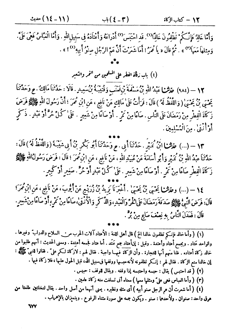 12 - (984) حَدَّثَنَا عَبْدُ اللهِ بْنُ مَسْلَمَةَ بْنِ قَعْنَبٍ، وَقُتَيْبَةُ بْنُ سَعِيدٍ، قَالَا: حَدَّثَنَا مَالِكٌ، ح وَحَدَّثَنَا يَحْيَى بْنُ يَحْيَى، - وَاللَّفْظُ لَهُ - قَالَ: قَرَأْتُ عَلَى مَالِكٍ، عَنْ نَافِعٍ، عَنِ ابْنِ عُمَرَ: «أَنَّ رَسُولَ اللهِ صَلَّى اللهُ عَلَيْهِ وَسَلَّمَ §فَرَضَ زَكَاةَ الْفِطْرِ مِنْ رَمَضَانَ عَلَى النَّاسِ، صَاعًا مِنْ تَمْرٍ، أَوْ صَاعًا مِنْ شَعِيرٍ، عَلَى كُلِّ حُرٍّ أَوْ عَبْدٍ، ذَكَرٍ أَوْ أُنْثَى، مِنَ الْمُسْلِمِينَ»