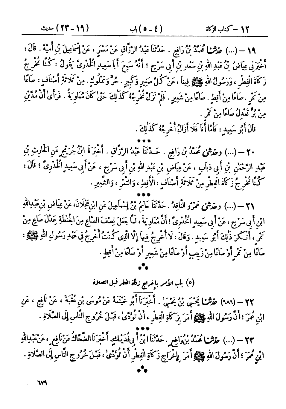 23 - (986) حَدَّثَنَا مُحَمَّدُ بْنُ رَافِعٍ، حَدَّثَنَا ابْنُ أَبِي فُدَيْكٍ، أَخْبَرَنَا الضَّحَّاكُ، عَنْ نَافِعٍ، عَنْ عَبْدِ اللهِ بْنِ عُمَرَ: «أَنَّ رَسُولَ اللهِ صَلَّى اللهُ عَلَيْهِ وَسَلَّمَ §أَمَرَ بِإِخْرَاجِ زَكَاةِ الْفِطْرِ، أَنْ تُؤَدَّى قَبْلَ خُرُوجِ النَّاسِ إِلَى الصَّلَاةِ»