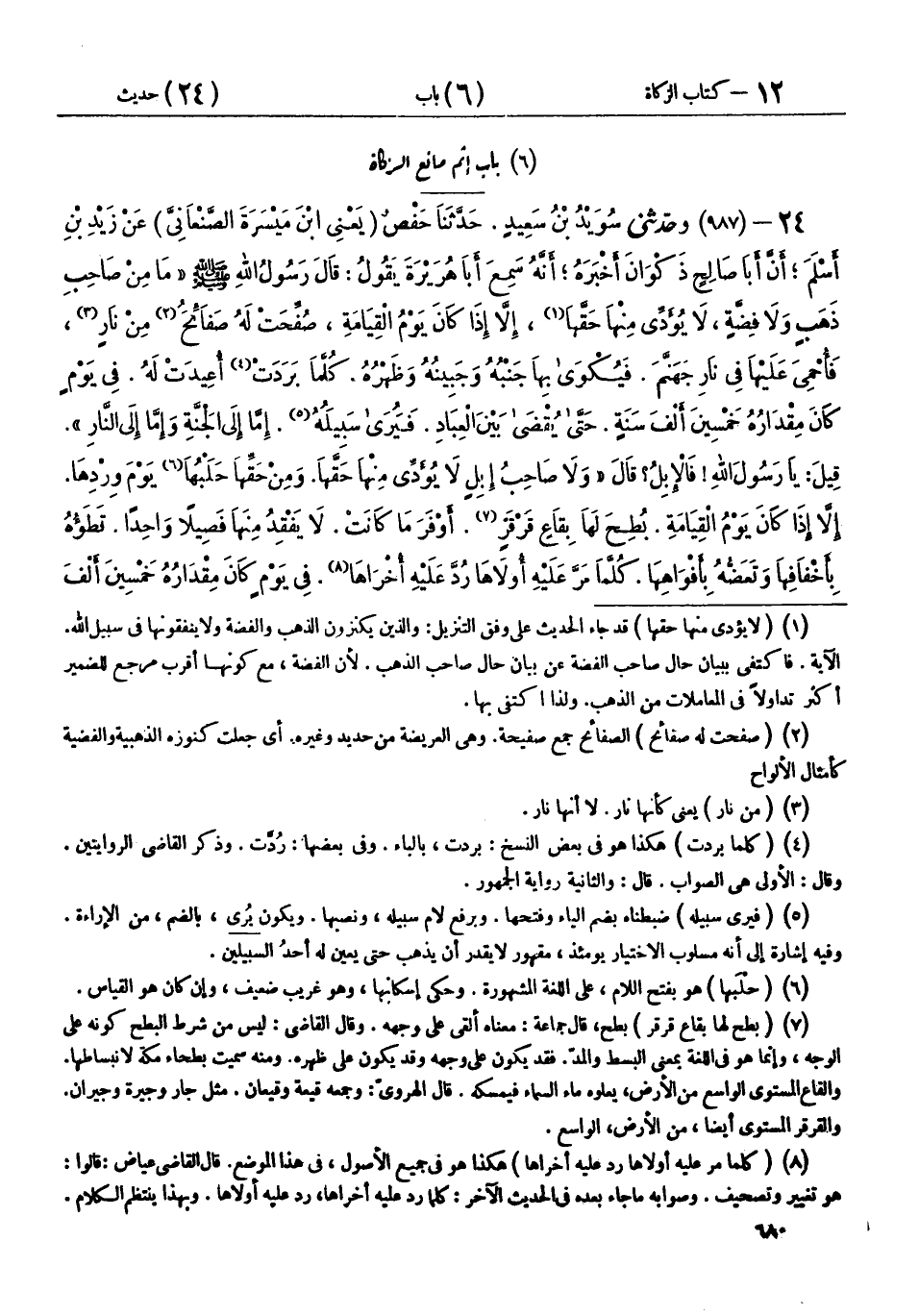 S [ ش (لا يؤدي منها حقها) قد جاء الحديث على وفق التنزيل والذين يكنزون الذهب والفضة ولا ينفقونها في سبيل الله الآية فاكتفى ببيان صاحب الفضة عن بيان حال صاحب الذهب لأن الفضة مع كونها أقرب مرجع للضمير أكثر تداولا في المعاملات من الذهب ولذا اكتفى بها (صفحت له صفائح) الصفائح جمع صفيحة وهي العريضة من الحديد وغيره أي جعلت كنوزه الذهبية والفضية كأمثال الألواح (من نار) يعني كأنها نار لا أنها نار (كلما بردت) هكذا هو في بعض النسخ بردت بالباء وفي بعضها ردت وذكر القاضي الروايتين وقال الأولى هي الصواب قال والثانية رواية الجمهور (فيرى سبيله) ضبطناه بضم الياء وفتحها وبرفع لام سبيله ونصبها ويكون يرى بالضم من الإراءة وفيه إشارة إلى أنه مسلوب الاختيار يومئذ مقهور لا يقدر أن يذهب حتى يعين له أحد السبيلين (حلبها) هو بفتح اللام على اللغة المشهورة وحكى إسكانها وهو غريب ضعيف وإن كان هو القياس (بطح لها بقاع قرقر) بطح قال جماعة معناه ألقي على وجهه وقال القاضي ليس من شرط البطح كونه على الوجه وإنما هو في اللغة بمعنى البسط والمد فقد يكون على وجهه وقد يكون على ظهره ومنه سميت بطحاء مكة لانبساطها والقاع المستوي الواسع من الأرض يعلوه ماء السماء فيمسكه قال الهروي وجمعه قيعة وقيعان مثل جار وجيرة وجيران والقرقر المستوي أيضا من الأرض الواسع (كلما مر عليه أولاها رد عليه أخراها) هكذا هو في جميع الأصول في هذا الموضع قال القاضي عياض قالوا هو تغيير وتصحيف وصوابها ما جاء بعده في الحديث الآخر كلما رد عليه أولاها وبهذا ينتظم الكلام (ليس فيها عقصاء ولا جلحاء ولا عضباء) قال أهل اللغة العقصاء ملتوية القرنين والجلحاء التي لا قرن لها والعضباء التي انكسر قرنها الداخل (تطؤه بأظلافها) الأظلاف جمع ظلف وهو للبقر والغنم بمنزلة الحافر للفرس (فأما التي هي له وزر) هكذا هو في أكثر النسخ التي ووقع في بعضها الذي وهو أوضح وأظهر (ونواء على أهل الإسلام) أي ماوأة ومعاداة (فرجل) أي فخيل رجل (ربطها في سبيل الله) أي أعدها للجهاد وأصله من الرباط وهو حبس الرجل نفسه في الثغر وإعداده الأهبة لذلك (في مرج وروضة) قال ابن الأثير المرج هو الأرض الواسعة ذات نبات كثير يمرج فيه الدواب أي تسرح والروضة أخص من المرعى (ولا تقطع طولها) أي حبلها الطويل الذي شد أحد طرفيه في يد الفرس والآخر في وتد أو غيره لتدور فيه وترعى من جوانبها ولا تذهب لوجهها قال النووي ويقال طيلها بالياء وكذا جاء في الموطأ (فاستنت شرفا أو شرفين) معنى استنت جرت وعدت والشرف هو العالي من الأرض وقيل المراد هنا طلقا أو طلقين وقال ابن الأثير الشرف هو الشوط (فالحمر) جمع حمار أي فما حكمها (ما أنزل علي في الحمر الخ) معنى الفاذة القليلة النظير والجامعة أي العامة المتناولة لكل خير ومعروف ومعنى الحديث لم ينزل علي فيها نص بعينها لكن نزلت هذه الآية العامة]