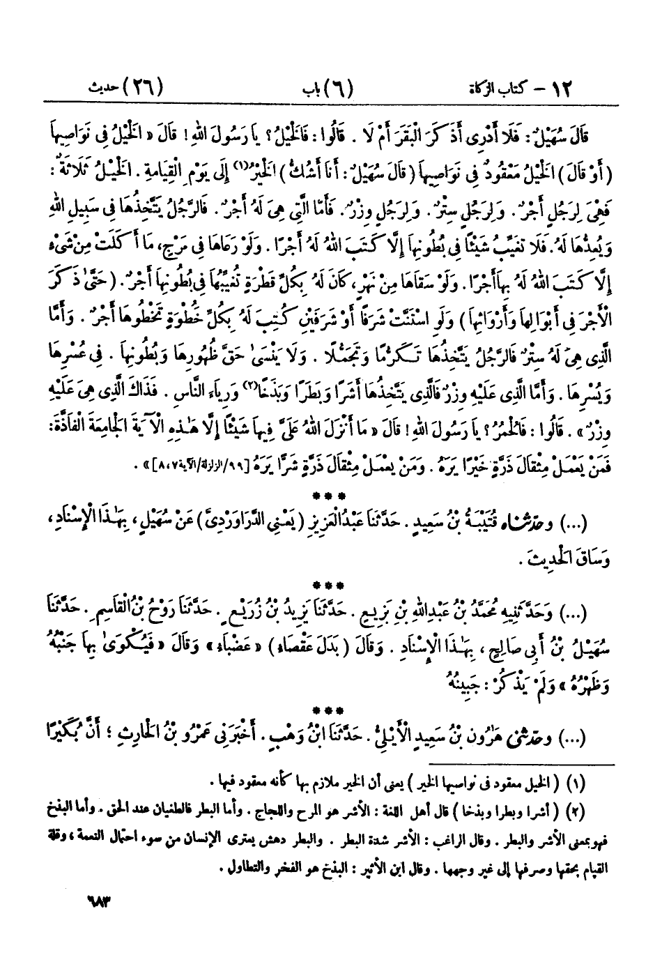 (987) وحَدَّثَنِيهِ مُحَمَّدُ بْنُ عَبْدِ اللهِ بْنِ بَزِيعٍ، حَدَّثَنَا يَزِيدُ بْنُ زُرَيْعٍ، حَدَّثَنَا رَوْحُ بْنُ الْقَاسِمِ، حَدَّثَنَا سُهَيْلُ بْنُ أَبِي صَالِحٍ بِهَذَا الْإِسْنَادِ وَقَالَ - بَدَلَ عَقْصَاءُ - «عَضْبَاءُ» وَقَالَ: «فَيُكْوَى بِهَا جَنْبُهُ وَظَهْرُهُ» وَلَمْ يَذْكُر: جَبِينُهُ.