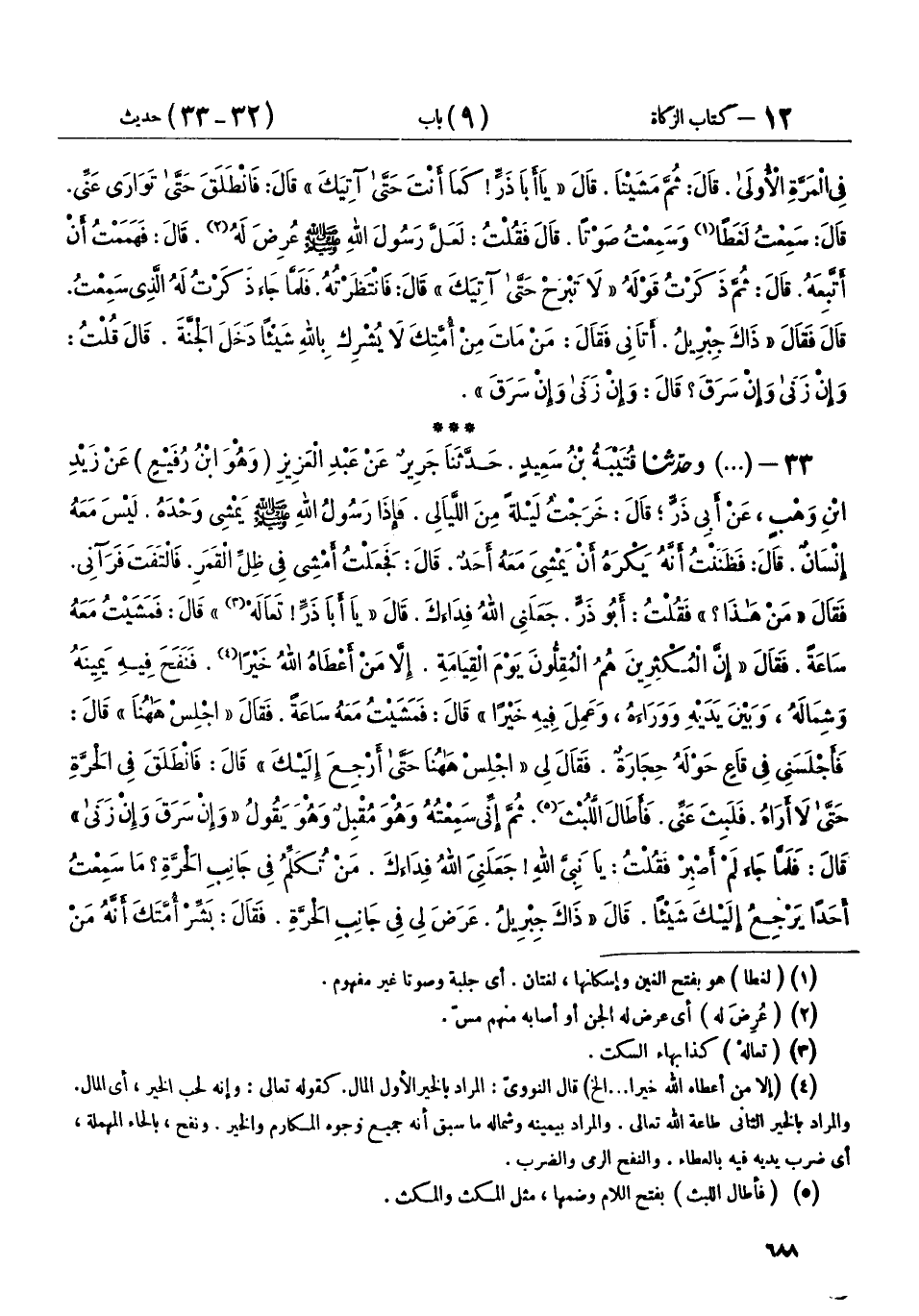 33 - (94) وحَدَّثَنَا قُتَيْبَةُ بْنُ سَعِيدٍ، حَدَّثَنَا جَرِيرٌ، عَنْ عَبْدِ الْعَزِيزِ وَهُوَ ابْنُ رُفَيْعٍ، عَنْ زَيْدِ بْنِ وَهْبٍ، عَنْ أَبِي ذَرٍّ، قَالَ: خَرَجْتُ لَيْلَةً مِنَ اللَّيَالِي، فَإِذَا رَسُولُ اللهِ صَلَّى اللهُ عَلَيْهِ وَسَلَّمَ يَمْشِي وَحْدَهُ، لَيْسَ مَعَهُ إِنْسَانٌ، قَالَ: فَظَنَنْتُ أَنَّهُ يَكْرَهُ أَنْ يَمْشِيَ مَعَهُ أَحَدٌ، قَالَ: فَجَعَلْتُ أَمْشِي فِي ظِلِّ الْقَمَرِ، فَالْتَفَتَ فَرَآنِي، فَقَالَ: «مَنْ هَذَا؟» فَقُلْتُ: أَبُو ذَرٍّ، جَعَلَنِي اللهُ فِدَاءَكَ، قَالَ: «يَا أَبَا ذَرٍّ، تَعَالَهْ» قَالَ: فَمَشَيْتُ مَعَهُ سَاعَةً، فَقَالَ: «§إِنَّ الْمُكْثِرِينَ هُمُ الْمُقِلُّونَ يَوْمَ الْقِيَامَةِ، إِلَّا مَنْ أَعْطَاهُ اللهُ خَيْرًا، فَنَفَحَ فِيهِ يَمِينَهُ وَشِمَالَهُ، وَبَيْنَ يَدَيْهِ وَوَرَاءَهُ، وَعَمِلَ فِيهِ خَيْرًا»
