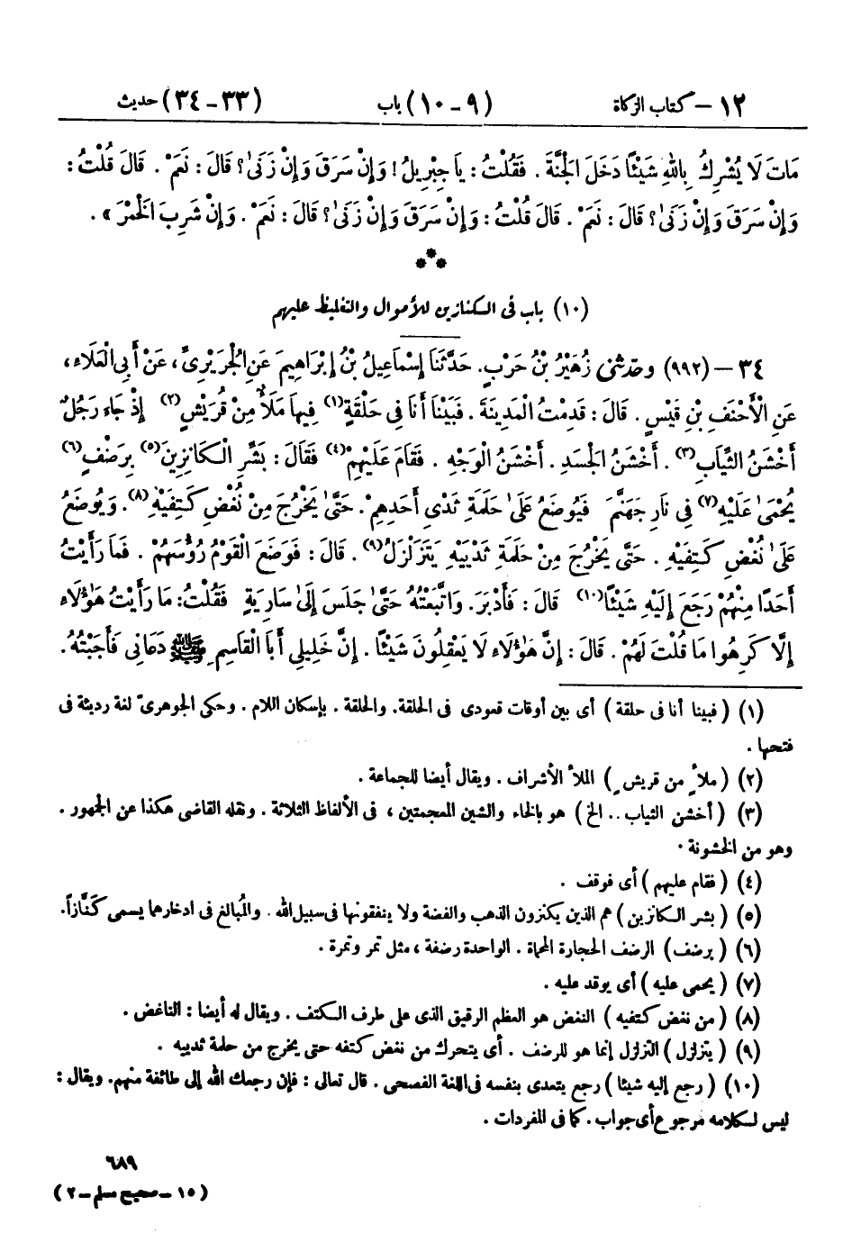 34 - (992) وحَدَّثَنِي زُهَيْرُ بْنُ حَرْبٍ، حَدَّثَنَا إِسْمَاعِيلُ بْنُ إِبْرَاهِيمَ، عَنِ الْجُرَيْرِيِّ، عَنْ أَبِي الْعَلَاءِ، عَنِ الْأَحْنَفِ بْنِ قَيْسٍ، قَالَ: قَدِمْتُ الْمَدِينَةَ فَبَيْنَا أَنَا فِي حَلْقَةٍ فِيهَا مَلَأٌ مِنْ قُرَيْشٍ إِذْ جَاءَ رَجُلٌ أَخْشَنُ الثِّيَابِ، أَخْشَنُ الْجَسَدِ، أَخْشَنُ الْوَجْهِ، فَقَامَ عَلَيْهِمْ، فَقَالَ: بَشِّرِ الْكَانِزِينَ بِرَضْفٍ يُحْمَى عَلَيْهِ فِي نَارِ جَهَنَّمَ، فَيُوضَعُ عَلَى حَلَمَةِ ثَدْيِ أَحَدِهِمْ، حَتَّى يَخْرُجَ مِنْ نُغْضِ كَتِفَيْهِ، وَيُوضَعُ عَلَى نُغْضِ كَتِفَيْهِ، حَتَّى يَخْرُجَ مِنْ حَلَمَةِ ثَدْيَيْهِ يَتَزَلْزَلُ، قَالَ: فَوَضَعَ الْقَوْمُ رُءُوسَهُمْ، فَمَا رَأَيْتُ أَحَدًا مِنْهُمْ رَجَعَ إِلَيْهِ شَيْئًا، قَالَ: فَأَدْبَرَ، وَاتَّبَعْتُهُ حَتَّى جَلَسَ إِلَى سَارِيَةٍ، فَقُلْتُ: مَا رَأَيْتُ هَؤُلَاءِ إِلَّا كَرِهُوا مَا قُلْتَ لَهُمْ، قَالَ: إِنَّ هَؤُلَاءِ لَا يَعْقِلُونَ شَيْئًا، إِنَّ خَلِيلِي أَبَا الْقَاسِمِ صَلَّى اللهُ عَلَيْهِ وَسَلَّمَ دَعَانِي فَأَجَبْتُهُ، فَقَالَ: «أَتَرَى أُحُدًا؟» فَنَظَرْتُ مَا عَلَيَّ مِنَ الشَّمْسِ وَأَنَا أَظُنُّ أَنَّهُ يَبْعَثُنِي فِي حَاجَةٍ لَهُ، فَقُلْتُ: أَرَاهُ، فَقَالَ: «§مَا يَسُرُّنِي أَنَّ لِي مِثْلَهُ ذَهَبًا أُنْفِقُهُ كُلَّهُ إِلَّا ثَلَاثَةَ دَنَانِيرَ» ثُمَّ هَؤُلَاءِ يَجْمَعُونَ الدُّنْيَا، لَا يَعْقِلُونَ شَيْئًا، قَالَ: قُلْتُ: مَا لَكَ وَلِإِخْوَتِكَ مِنْ قُرَيْشٍ، لَا تَعْتَرِيهِمْ وَتُصِيبُ مِنْهُمْ، قَالَ: لَا، وَرَبِّكَ، لَا أَسْأَلُهُمْ عَنْ دُنْيَا، وَلَا أَسْتَفْتِيهِمْ عَنْ دِينٍ، حَتَّى أَلْحَقَ بِاللهِ وَرَسُولِهِ