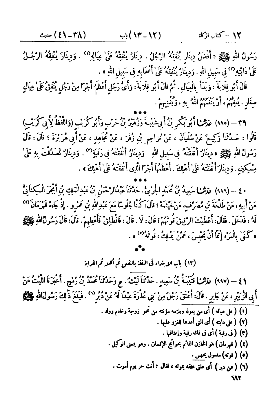 41 - (997) حَدَّثَنَا قُتَيْبَةُ بْنُ سَعِيدٍ، حَدَّثَنَا لَيْثٌ، ح وحَدَّثَنَا مُحَمَّدُ بْنُ رُمْحٍ، أَخْبَرَنَا اللَّيْثُ، عَنْ أَبِي الزُّبَيْرِ، عَنْ جَابِرٍ، قَالَ: أَعْتَقَ رَجُلٌ مِنْ بَنِي عُذْرَةَ عَبْدًا لَهُ عَنْ دُبُرٍ، فَبَلَغَ ذَلِكَ رَسُولَ اللهِ صَلَّى اللهُ عَلَيْهِ وَسَلَّمَ فَقَالَ: «§أَلَكَ مَالٌ غَيْرُهُ؟» فَقَالَ: لَا، فَقَالَ: «مَنْ يَشْتَرِيهِ مِنِّي؟» فَاشْتَرَاهُ نُعَيْمُ بْنُ عَبْدِ اللهِ الْعَدَوِيُّ بِثَمَانِ مِائَةِ دِرْهَمٍ، فَجَاءَ بِهَا رَسُولَ اللهِ صَلَّى اللهُ عَلَيْهِ وَسَلَّمَ فَدَفَعَهَا إِلَيْهِ، ثُمَّ قَالَ: «ابْدَأْ بِنَفْسِكَ فَتَصَدَّقْ عَلَيْهَا، فَإِنْ فَضَلَ شَيْءٌ فَلِأَهْلِكَ، فَإِنْ فَضَلَ عَنْ أَهْلِكَ شَيْءٌ فَلِذِي قَرَابَتِكَ، فَإِنْ فَضَلَ عَنْ ذِي قَرَابَتِكَ شَيْءٌ فَهَكَذَا وَهَكَذَا» يَقُولُ: فَبَيْنَ يَدَيْكَ وَعَنْ يَمِينِكَ وَعَنْ شِمَالِكَ