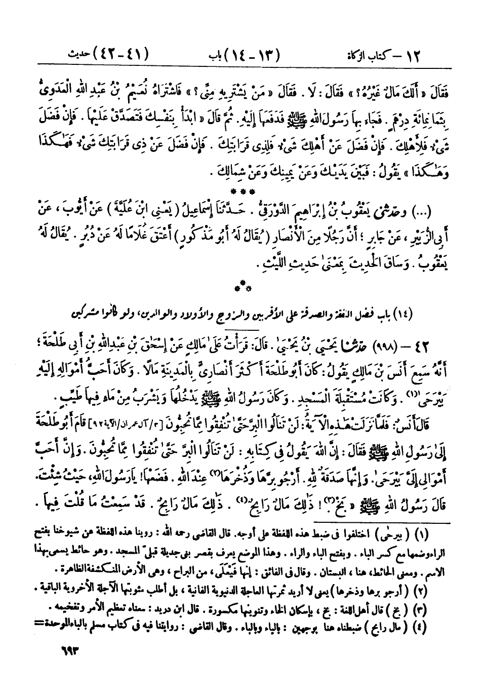 42 - (998) حَدَّثَنَا يَحْيَى بْنُ يَحْيَى، قَالَ: قَرَأْتُ عَلَى مَالِكٍ، عَنْ إِسْحَاقَ بْنِ عَبْدِ اللهِ بْنِ أَبِي طَلْحَةَ، أَنَّهُ سَمِعَ أَنَسَ بْنَ مَالِكٍ، يَقُولُ: كَانَ أَبُو طَلْحَةَ أَكْثَرَ أَنْصَارِيٍّ بِالْمَدِينَةِ مَالًا، وَكَانَ أَحَبُّ أَمْوَالِهِ إِلَيْهِ بَيْرَحَى، وَكَانَتْ مُسْتَقْبِلَةَ الْمَسْجِدِ، وَكَانَ رَسُولُ اللهِ صَلَّى اللهُ عَلَيْهِ وَسَلَّمَ يَدْخُلُهَا وَيَشْرَبُ مِنْ مَاءٍ فِيهَا طَيِّبٍ، قَالَ أَنَسٌ: فَلَمَّا نَزَلَتْ هَذِهِ الْآيَةُ: {لَنْ تَنَالُوا الْبِرَّ حَتَّى تُنْفِقُوا مِمَّا تُحِبُّونَ} [آل عمران: 92] قَامَ أَبُو طَلْحَةَ إِلَى رَسُولِ اللهِ صَلَّى اللهُ عَلَيْهِ وَسَلَّمَ فَقَالَ: إِنَّ اللهَ يَقُولُ فِي كِتَابِهِ: {لَنْ تَنَالُوا الْبِرَّ حَتَّى تُنْفِقُوا مِمَّا تُحِبُّونَ} [آل عمران: 92]، وَإِنَّ أَحَبَّ أَمْوَالِي إِلَيَّ بَيْرَحَى، وَإِنَّهَا صَدَقَةٌ لِلَّهِ، أَرْجُو بِرَّهَا وَذُخْرَهَا عِنْدَ اللهِ، فَضَعْهَا، يَا رَسُولَ اللهِ، حَيْثُ شِئْتَ، قَالَ رَسُولُ اللهِ صَلَّى اللهُ عَلَيْهِ وَسَلَّمَ: «§بَخْ، ذَلِكَ مَالٌ رَابِحٌ، ذَلِكَ مَالٌ رَابِحٌ، قَدْ سَمِعْتُ مَا قُلْتَ فِيهَا، وَإِنِّي أَرَى أَنْ تَجْعَلَهَا فِي الْأَقْرَبِينَ» فَقَسَمَهَا أَبُو طَلْحَةَ فِي أَقَارِبِهِ وَبَنِي عَمِّهِ
