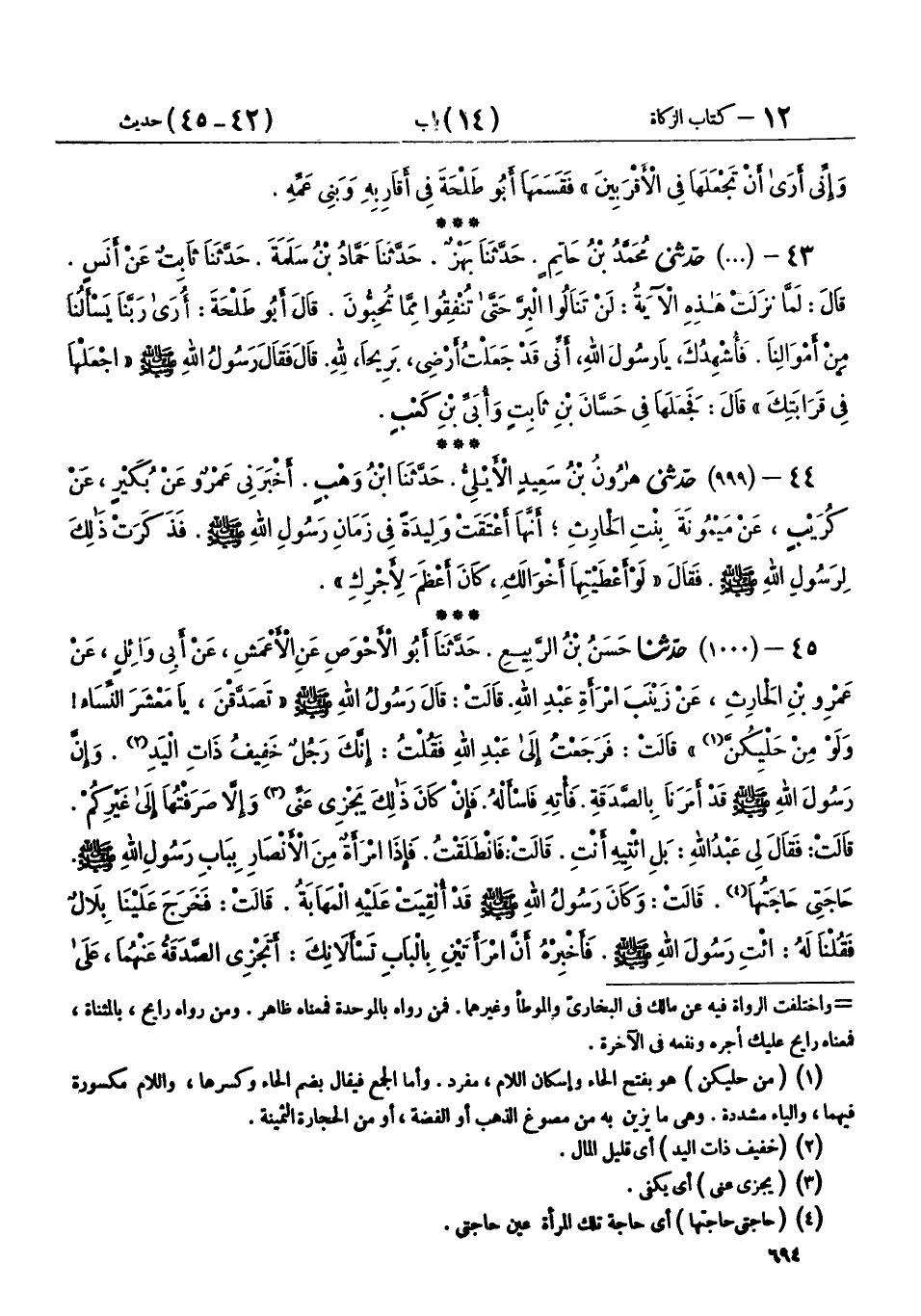 45 - (1000) حَدَّثَنَا حَسَنُ بْنُ الرَّبِيعِ، حَدَّثَنَا أَبُو الْأَحْوَصِ، عَنِ الْأَعْمَشِ، عَنْ أَبِي وَائِلٍ، عَنْ عَمْرِو بْنِ الْحَارِثِ، عَنْ زَيْنَبَ، امْرَأَةِ عَبْدِ اللهِ قَالَتْ: قَالَ رَسُولُ اللهِ صَلَّى اللهُ عَلَيْهِ وَسَلَّمَ: «§تَصَدَّقْنَ، يَا مَعْشَرَ النِّسَاءِ، وَلَوْ مِنْ حُلِيِّكُنَّ» قَالَتْ: فَرَجَعْتُ إِلَى عَبْدِ اللهِ فَقُلْتُ: إِنَّكَ رَجُلٌ خَفِيفُ ذَاتِ الْيَدِ، وَإِنَّ رَسُولَ اللهِ صَلَّى اللهُ عَلَيْهِ وَسَلَّمَ قَدْ أَمَرَنَا بِالصَّدَقَةِ، فَأْتِهِ فَاسْأَلْهُ، فَإِنْ كَانَ ذَلِكَ يَجْزِي عَنِّي وَإِلَّا صَرَفْتُهَا إِلَى غَيْرِكُمْ، قَالَتْ: فَقَالَ لِي عَبْدُ اللهِ: بَلِ ائْتِيهِ أَنْتِ، قَالَتْ: فَانْطَلَقْتُ، فَإِذَا امْرَأَةٌ مِنَ الْأَنْصَارِ بِبَابِ رَسُولِ اللهِ صَلَّى اللهُ عَلَيْهِ وَسَلَّمَ حَاجَتِي حَاجَتُهَا، قَالَتْ: وَكَانَ رَسُولُ اللهِ صَلَّى اللهُ عَلَيْهِ وَسَلَّمَ قَدْ أُلْقِيَتْ عَلَيْهِ الْمَهَابَةُ، قَالَتْ: فَخَرَجَ عَلَيْنَا بِلَالٌ فَقُلْنَا لَهُ: ائْتِ رَسُولَ اللهِ صَلَّى اللهُ عَلَيْهِ وَسَلَّمَ، فَأَخْبِرْهُ أَنَّ امْرَأَتَيْنِ بِالْبَابِ تَسْأَلَانِكَ: أَتُجْزِئُ الصَّدَقَةُ عَنْهُمَا، عَلَى أَزْوَاجِهِمَا، وَعَلَى أَيْتَامٍ فِي حُجُورِهِمَا؟ وَلَا تُخْبِرْهُ مَنْ نَحْنُ، قَالَتْ: فَدَخَلَ بِلَالٌ عَلَى رَسُولِ اللهِ صَلَّى اللهُ عَلَيْهِ وَسَلَّمَ فَسَأَلَهُ، فَقَالَ لَهُ رَسُولُ اللهِ صَلَّى اللهُ عَلَيْهِ وَسَلَّمَ: «مَنْ هُمَا؟» فَقَالَ: امْرَأَةٌ مِنَ الْأَنْصَارِ وَزَيْنَبُ، فَقَالَ رَسُولُ اللهِ صَلَّى اللهُ عَلَيْهِ وَسَلَّمَ: «أَيُّ الزَّيَانِبِ؟» قَالَ: امْرَأَةُ عَبْدِ اللهِ، فَقَالَ لَهُ رَسُولُ اللهِ صَلَّى اللهُ عَلَيْهِ وَسَلَّمَ: " لَهُمَا أَجْرَانِ: أَجْرُ الْقَرَابَةِ، وَأَجْرُ الصَّدَقَةِ "