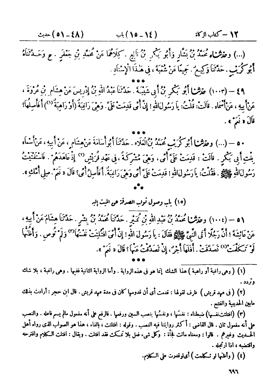 50 - (1003) وحَدَّثَنَا أَبُو كُرَيْبٍ مُحَمَّدُ بْنُ الْعَلَاءِ، حَدَّثَنَا أَبُو أُسَامَةَ، عَنْ هِشَامٍ، عَنْ أَبِيهِ، عَنْ أَسْمَاءَ بِنْتِ أَبِي بَكْرٍ، قَالَتْ: قَدِمَتْ عَلَيَّ أُمِّي وَهِيَ مُشْرِكَةٌ فِي عَهْدِ قُرَيْشٍ إِذْ عَاهَدَهُمْ فَاسْتَفْتَيْتُ رَسُولَ اللهِ صَلَّى اللهُ عَلَيْهِ وَسَلَّمَ، فَقُلْتُ: يَا رَسُولَ اللهِ، §قَدِمَتْ عَلَيَّ أُمِّي وَهِيَ رَاغِبَةٌ، أَفَأَصِلُ أُمِّي؟ قَالَ: «نَعَمْ، صِلِي أُمَّكِ»