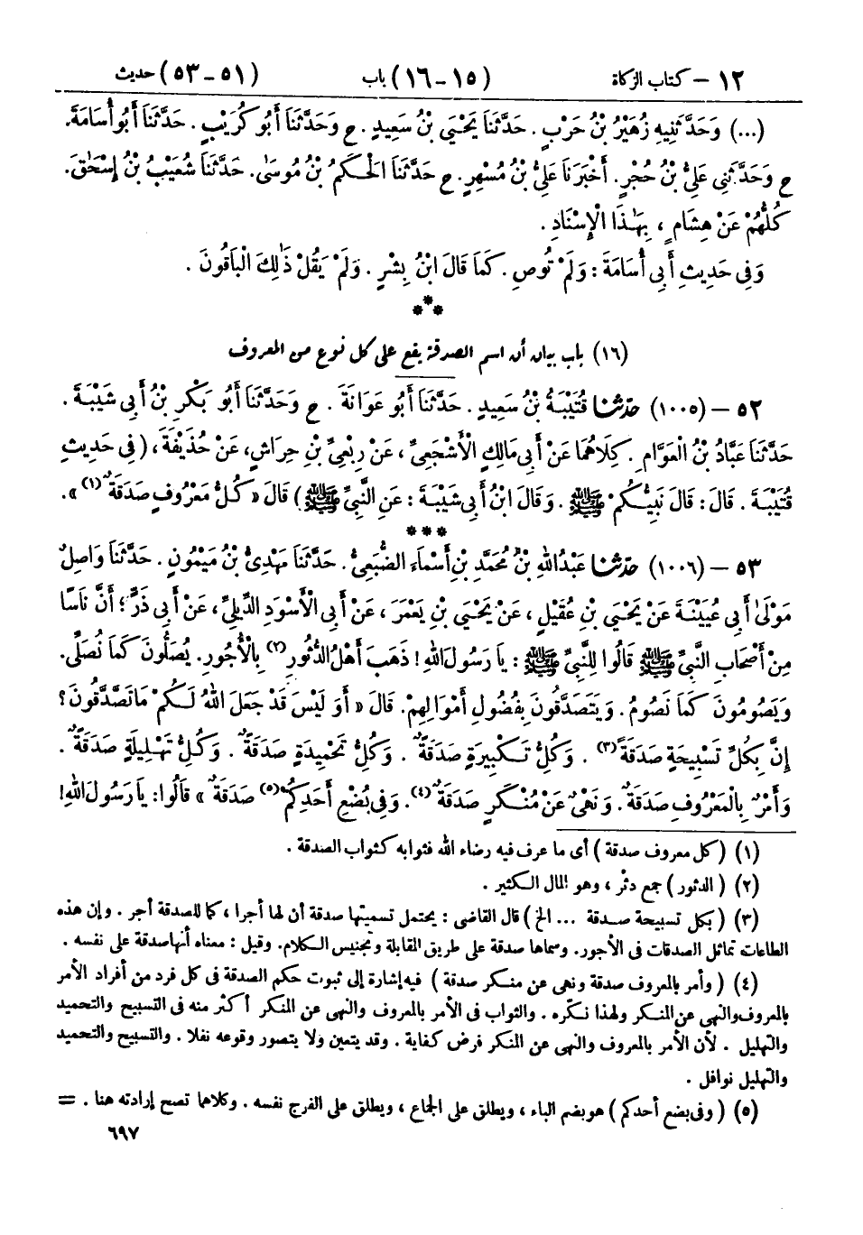 52 - (1005) حَدَّثَنَا قُتَيْبَةُ بْنُ سَعِيدٍ، حَدَّثَنَا أَبُو عَوَانَةَ، ح وحَدَّثَنَا أَبُو بَكْرِ بْنُ أَبِي شَيْبَةَ، حَدَّثَنَا عَبَّادُ بْنُ الْعَوَّامِ، كِلَاهُمَا عَنْ أَبِي مَالِكٍ الْأَشْجَعِيِّ، عَنْ رِبْعِيِّ بْنِ حِرَاشٍ، عَنْ حُذَيْفَةَ - فِي حَدِيثِ قُتَيْبَةَ، قَالَ: قَالَ نَبِيُّكُمْ صَلَّى اللهُ عَلَيْهِ وَسَلَّمَ، وَقَالَ ابْنُ أَبِي شَيْبَةَ: - عَنِ النَّبِيِّ صَلَّى اللهُ عَلَيْهِ وَسَلَّمَ قَالَ: «§كُلُّ مَعْرُوفٍ صَدَقَةٌ»