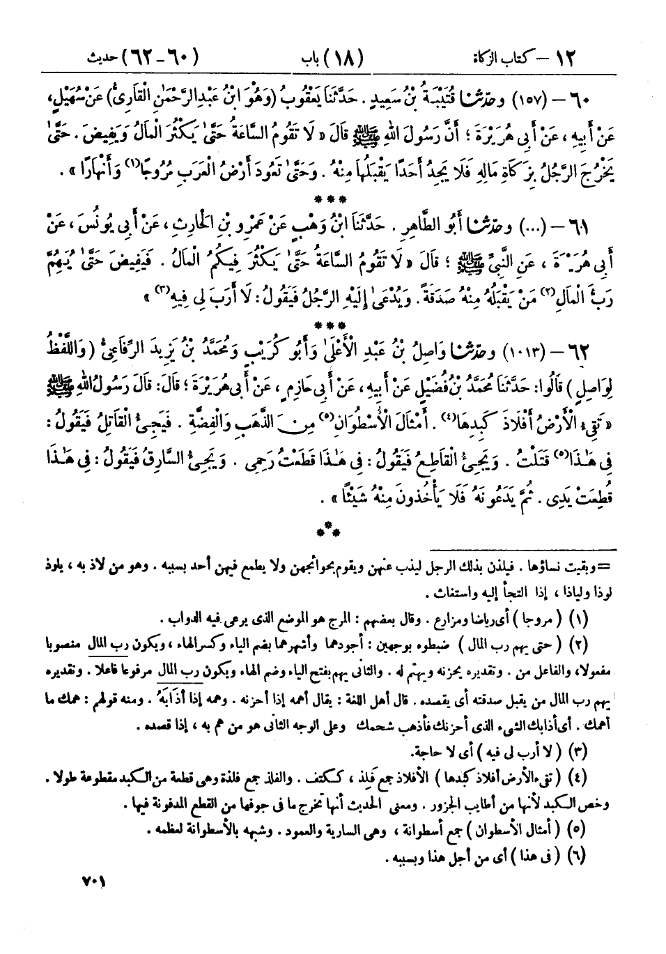 60 - (157) وحَدَّثَنَا قُتَيْبَةُ بْنُ سَعِيدٍ، حَدَّثَنَا يَعْقُوبُ وَهُوَ ابْنُ عَبْدِ الرَّحْمَنِ الْقَارِيُّ، عَنْ سُهَيْلٍ، عَنْ أَبِيهِ، عَنْ أَبِي هُرَيْرَةَ، أَنَّ رَسُولَ اللهِ صَلَّى اللهُ عَلَيْهِ وَسَلَّمَ قَالَ: «§لَا تَقُومُ السَّاعَةُ حَتَّى يَكْثُرَ الْمَالُ وَيَفِيضَ، حَتَّى يَخْرُجَ الرَّجُلُ بِزَكَاةِ مَالِهِ فَلَا يَجِدُ أَحَدًا يَقْبَلُهَا مِنْهُ، وَحَتَّى تَعُودَ أَرْضُ الْعَرَبِ مُرُوجًا وَأَنْهَارًا»