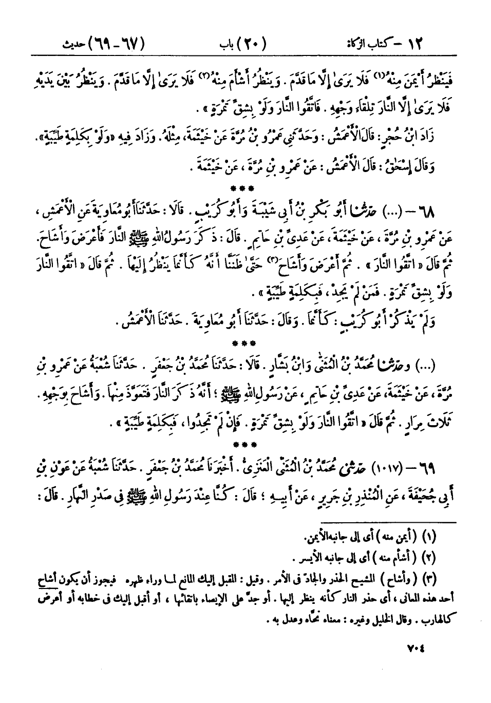 68 - (1016) حَدَّثَنَا أَبُو بَكْرِ بْنُ أَبِي شَيْبَةَ، وَأَبُو كُرَيْبٍ، قَالَا: حَدَّثَنَا أَبُو مُعَاوِيَةَ، عَنِ الْأَعْمَشِ، عَنْ عَمْرِو بْنِ مُرَّةَ، عَنْ خَيْثَمَةَ، عَنْ عَدِيِّ بْنِ حَاتِمٍ، قَالَ: ذَكَرَ رَسُولُ اللهِ صَلَّى اللهُ عَلَيْهِ وَسَلَّمَ النَّارَ فَأَعْرَضَ وَأَشَاحَ، ثُمَّ قَالَ: «§اتَّقُوا النَّارَ» ثُمَّ أَعْرَضَ وَأَشَاحَ حَتَّى ظَنَنَّا أَنَّهُ كَأَنَّمَا يَنْظُرُ إِلَيْهَا، ثُمَّ قَالَ: «اتَّقُوا النَّارَ وَلَوْ بِشِقِّ تَمْرَةٍ، فَمَنْ لَمْ يَجِدْ، فَبِكَلِمَةٍ طَيِّبَةٍ» وَلَمْ يَذْكُرْ أَبُو كُرَيْبٍ، كَأَنَّمَا، وَقَالَ: حَدَّثَنَا أَبُو مُعَاوِيَةَ، حَدَّثَنَا الْأَعْمَشُ