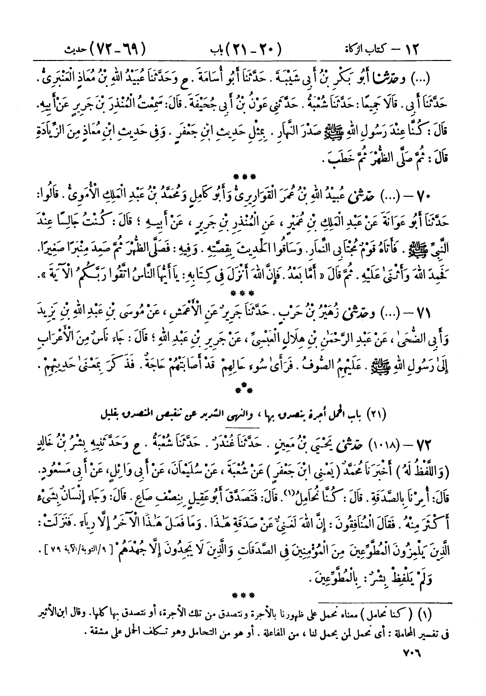 72 - (1018) حَدَّثَنِي يَحْيَى بْنُ مَعِينٍ، حَدَّثَنَا غُنْدَرٌ، حَدَّثَنَا شُعْبَةُ، ح وحَدَّثَنِيهِ بِشْرُ بْنُ خَالِدٍ، - وَاللَّفْظُ لَهُ - أَخْبَرَنَا مُحَمَّدٌ يَعْنِي ابْنَ جَعْفَرٍ، عَنْ شُعْبَةَ، عَنْ سُلَيْمَانَ، عَنْ أَبِي وَائِلٍ، عَنْ أَبِي مَسْعُودٍ، قَالَ: «§أُمِرْنَا بِالصَّدَقَةِ» قَالَ: كُنَّا نُحَامِلُ، قَالَ فَتَصَدَّقَ أَبُو عَقِيلٍ بِنِصْفِ صَاعٍ، قَالَ: وَجَاءَ إِنْسَانٌ بِشَيْءٍ أَكْثَرَ مِنْهُ، فَقَالَ الْمُنَافِقُونَ: إِنَّ اللهَ لَغَنِيٌّ عَنْ صَدَقَةِ هَذَا، وَمَا فَعَلَ هَذَا الْآخَرُ إِلَّا رِيَاءً، فَنَزَلَتْ: {الَّذِينَ يَلْمِزُونَ الْمُطَّوِّعِينَ مِنَ الْمُؤْمِنِينَ فِي الصَّدَقَاتِ وَالَّذِينَ لَا يَجِدُونَ إِلَّا جُهْدَهُمْ} [التوبة: 79] وَلَمْ يَلْفِظْ بِشْرٌ بِالْمُطَّوِّعِينَ