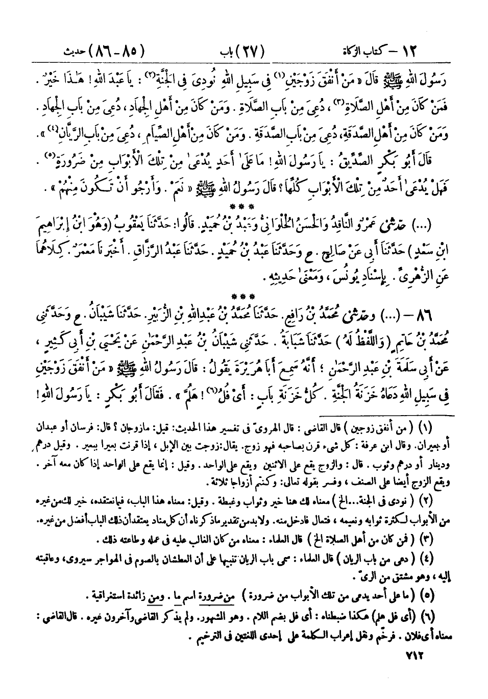 86 - (1027) وحَدَّثَنِي مُحَمَّدُ بْنُ رَافِعٍ، حَدَّثَنَا مُحَمَّدُ بْنُ عَبْدِ اللهِ بْنِ الزُّبَيْرِ، حَدَّثَنَا شَيْبَانُ، ح وحَدَّثَنِي مُحَمَّدُ بْنُ حَاتِمٍ - وَاللَّفْظُ لَهُ - حَدَّثَنَا شَبَابَةُ، حَدَّثَنِي شَيْبَانُ بْنُ عَبْدِ الرَّحْمَنِ، عَنْ يَحْيَى بْنِ أَبِي كَثِيرٍ، عَنْ أَبِي سَلَمَةَ بْنِ عَبْدِ الرَّحْمَنِ، أَنَّهُ سَمِعَ أَبَا هُرَيْرَةَ، يَقُولُ: قَالَ رَسُولُ اللهِ صَلَّى اللهُ عَلَيْهِ وَسَلَّمَ: " §مَنْ أَنْفَقَ زَوْجَيْنِ فِي سَبِيلِ اللهِ، دَعَاهُ خَزَنَةُ الْجَنَّةِ، كُلُّ خَزَنَةِ بَابٍ: أَيْ فُلُ، هَلُمَّ " فَقَالَ أَبُو بَكْرٍ: يَا رَسُولَ اللهِ، ذَلِكَ الَّذِي لَا تَوَى عَلَيْهِ، قَالَ رَسُولُ اللهِ صَلَّى اللهُ عَلَيْهِ وَسَلَّمَ: «إِنِّي لَأَرْجُو أَنْ تَكُونَ مِنْهُمْ»