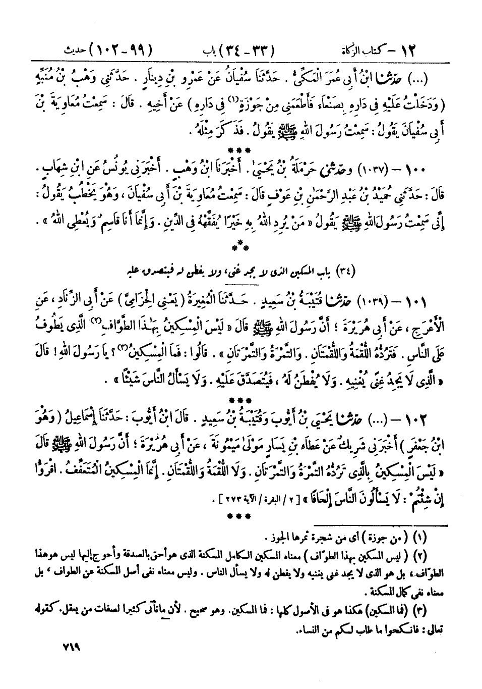 101 - (1039) حَدَّثَنَا قُتَيْبَةُ بْنُ سَعِيدٍ، حَدَّثَنَا الْمُغِيرَةُ يَعْنِي الْحِزَامِيَّ، عَنْ أَبِي الزِّنَادِ، عَنِ الْأَعْرَجِ، عَنْ أَبِي هُرَيْرَةَ، أَنَّ رَسُولَ اللهِ صَلَّى اللهُ عَلَيْهِ وَسَلَّمَ، قَالَ: «§لَيْسَ الْمِسْكِينُ بِهَذَا الطَّوَّافِ الَّذِي يَطُوفُ عَلَى النَّاسِ، فَتَرُدُّهُ اللُّقْمَةُ وَاللُّقْمَتَانِ، وَالتَّمْرَةُ وَالتَّمْرَتَانِ» قَالُوا، فَمَا الْمِسْكِينُ؟ يَا رَسُولَ اللهِ، قَالَ: «الَّذِي لَا يَجِدُ غِنًى يُغْنِيهِ، وَلَا يُفْطَنُ لَهُ، فَيُتَصَدَّقَ عَلَيْهِ، وَلَا يَسْأَلُ النَّاسَ شَيْئًا»