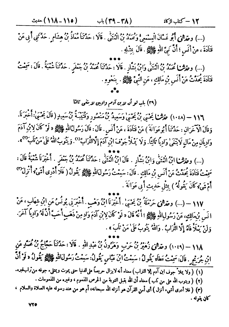 116 - (1048) حَدَّثَنَا يَحْيَى بْنُ يَحْيَى، وَسَعِيدُ بْنُ مَنْصُورٍ، وَقُتَيْبَةُ بْنُ سَعِيدٍ، - قَالَ يَحْيَى: أَخْبَرَنَا، وَقَالَ الْآخَرَانِ: - حَدَّثَنَا أَبُو عَوَانَةَ، عَنْ قَتَادَةَ، عَنْ أَنَسٍ، قَالَ: قَالَ رَسُولُ اللهِ صَلَّى اللهُ عَلَيْهِ وَسَلَّمَ: «§لَوْ كَانَ لِابْنِ آدَمَ وَادِيَانِ مِنْ مَالٍ لَابْتَغَى وَادِيًا ثَالِثًا، وَلَا يَمْلَأُ جَوْفَ ابْنِ آدَمَ إِلَّا التُّرَابُ، وَيَتُوبُ اللهُ عَلَى مَنْ تَابَ»