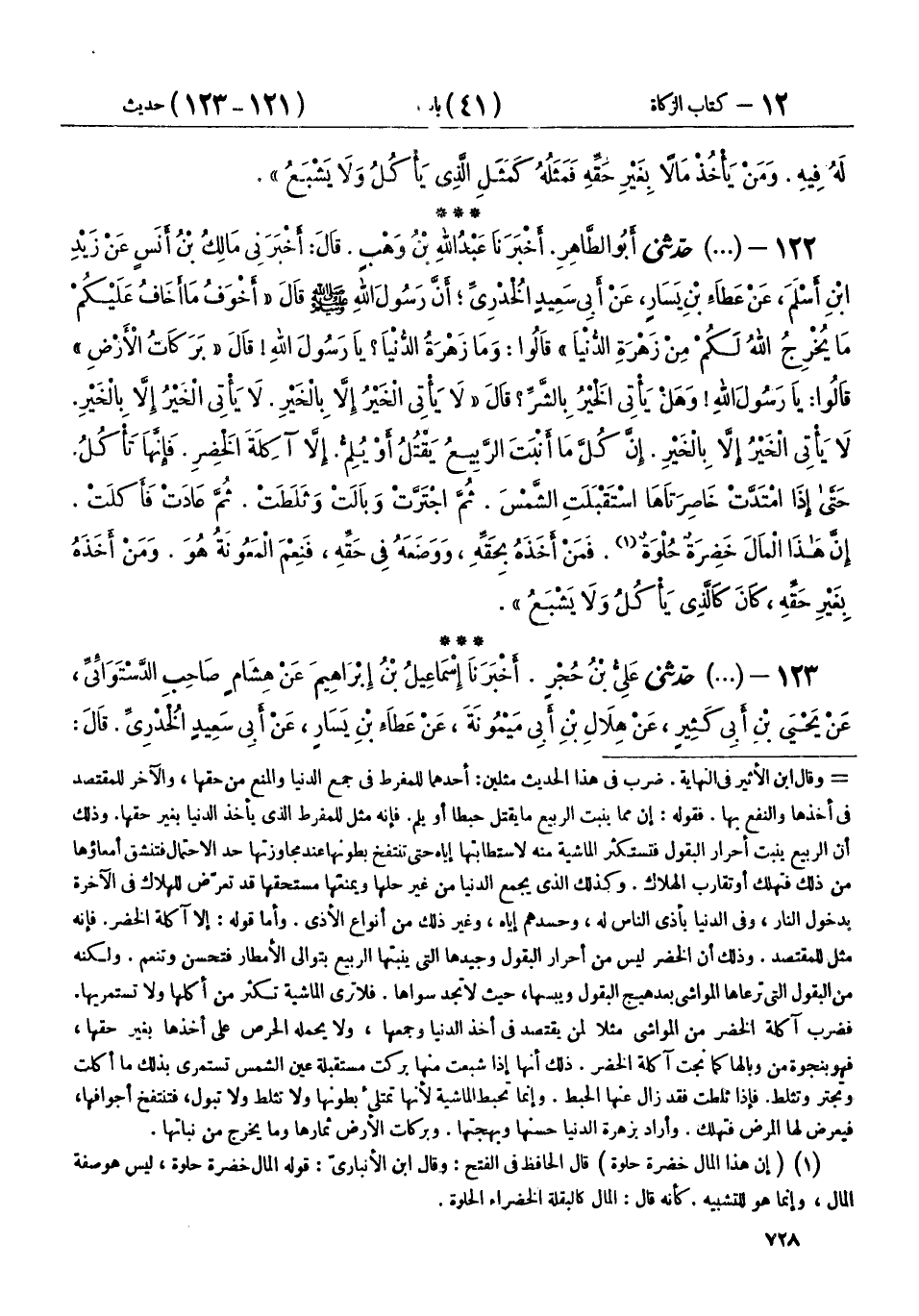 122 - (1052) حَدَّثَنِي أَبُو الطَّاهِرِ، أَخْبَرَنَا عَبْدُ اللهِ بْنُ وَهْبٍ، قَالَ: أَخْبَرَنِي مَالِكُ بْنُ أَنَسٍ، عَنْ زَيْدِ بْنِ أَسْلَمَ، عَنْ عَطَاءِ بْنِ يَسَارٍ، عَنْ أَبِي سَعِيدٍ الْخُدْرِيِّ، أَنَّ رَسُولَ اللهِ صَلَّى اللهُ عَلَيْهِ وَسَلَّمَ قَالَ: «§أَخْوَفُ مَا أَخَافُ عَلَيْكُمْ مَا يُخْرِجُ اللهُ لَكُمْ مِنْ زَهْرَةِ الدُّنْيَا» قَالُوا: وَمَا زَهْرَةُ الدُّنْيَا؟ يَا رَسُولَ اللهِ، قَالَ: «بَرَكَاتُ الْأَرْضِ» قَالُوا: يَا رَسُولَ اللهِ، وَهَلْ يَأْتِي الْخَيْرُ بِالشَّرِّ؟ قَالَ: لَا يَأْتِي الْخَيْرُ إِلَّا بِالْخَيْرِ، لَا يَأْتِي الْخَيْرُ إِلَّا بِالْخَيْرِ، لَا يَأْتِي الْخَيْرُ إِلَّا بِالْخَيْرِ، إِنَّ كُلَّ مَا أَنْبَتَ الرَّبِيعُ يَقْتُلُ أَوْ يُلِمُّ، إِلَّا آكِلَةَ الْخَضِرِ، فَإِنَّهَا تَأْكُلُ، حَتَّى إِذَا امْتَدَّتْ خَاصِرَتَاهَا اسْتَقْبَلَتِ الشَّمْسَ، ثُمَّ اجْتَرَّتْ وَبَالَتْ وَثَلَطَتْ، ثُمَّ عَادَتْ فَأَكَلَتْ، إِنَّ هَذَا الْمَالَ خَضِرَةٌ حُلْوَةٌ، فَمَنْ أَخَذَهُ بِحَقِّهِ، وَوَضَعَهُ فِي حَقِّهِ، فَنِعْمَ الْمَعُونَةُ هُوَ، وَمَنْ أَخَذَهُ بِغَيْرِ حَقِّهِ، كَانَ كَالَّذِي يَأْكُلُ وَلَا يَشْبَعُ "